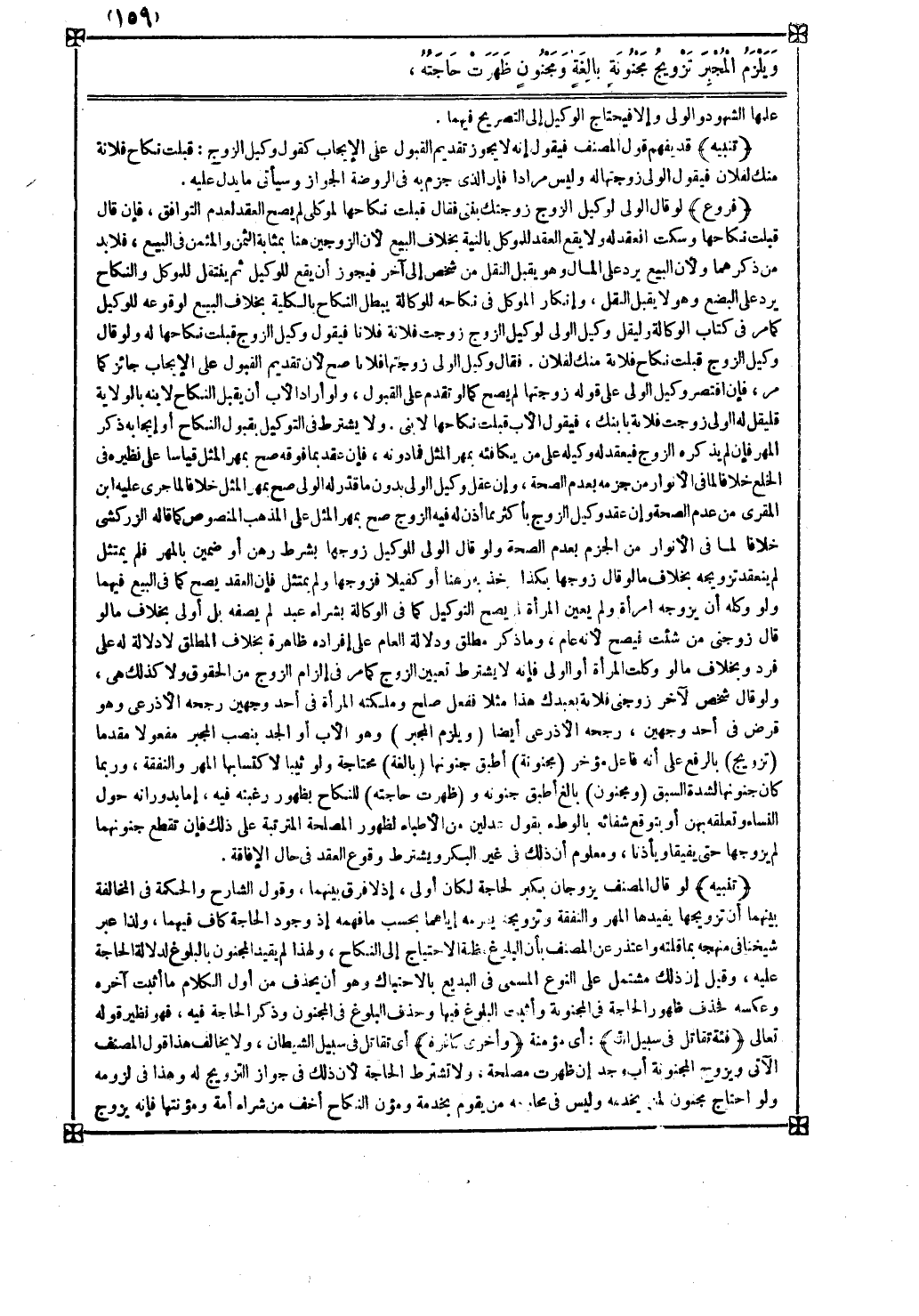 ( ويلزم المجبر ) وهو الأب أو الجد بنصب المجبر مفعولا مقدما ( تزويج ) بالرفع على أنه فاعل مؤخر ( مجنونة ) أطبق جنونها ( بالغة ) محتاجة ولو ثيبا لاكتسابها المهر والنفقة وربما كان جنونها لشدة الشبق