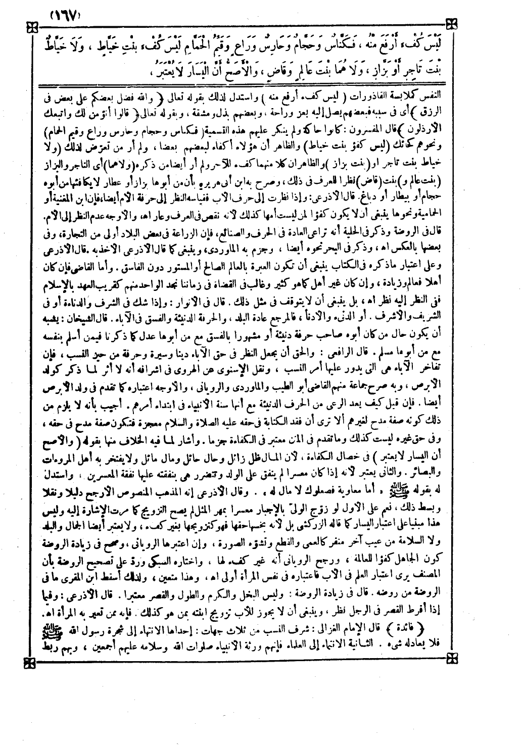 فائدة قال الإمام الغزالي شرف النسب من ثلاث جهات إحداها الانتهاء إلى شجرة رسول الله صلى الله عليه وسلم فلا يعادله شيء