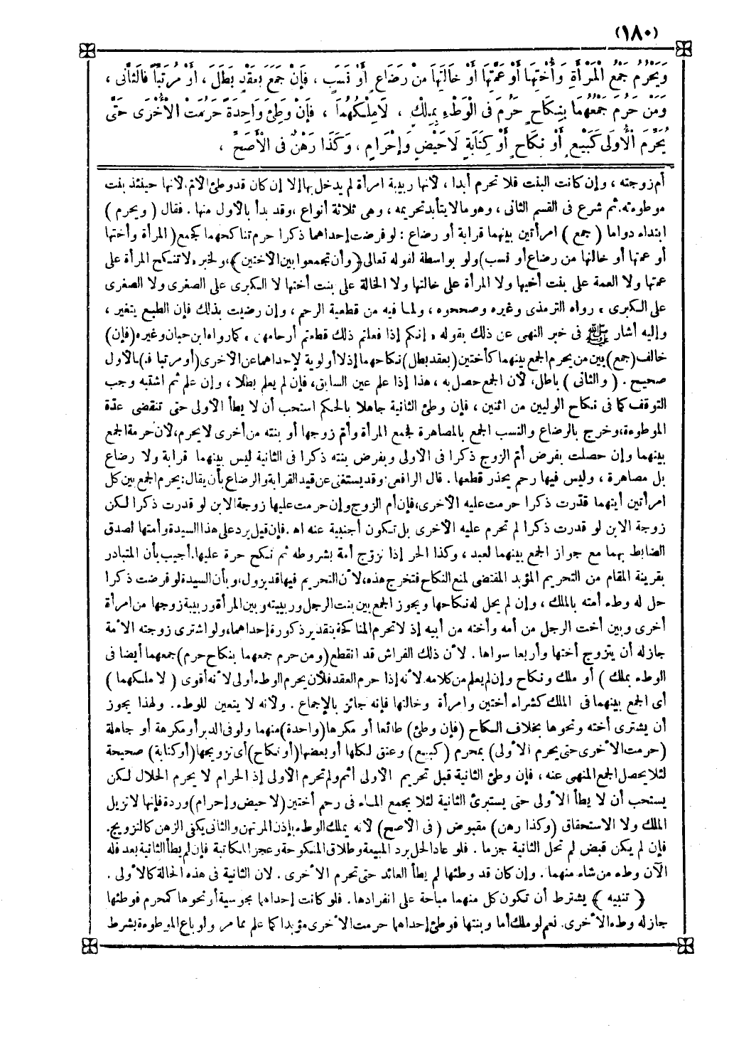 فقال ( ويحرم ) ابتداء دواما ( جمع ) امرأتين بينهما قرابة أو رضاع لو فرضت إحداهما ذكرا حرم تناكحهما كجمع ( المرأة وأختها أو عمتها أو خالتها من رضاع أو نسب ) ولو بواسطة لقوله تعالى { وأن تجمعوا بين الأختين } ولخبر لا تنكح المرأة على عمتها ولا العمة على بنت أخيها ولا المرأة على خالتها ولا الخالة على بنت أختها لا الكبرى على الصغرى ولا الصغرى على الكبرى رواه الترمذي وغيره وصححوه ولما فيه من قطعية الرحم