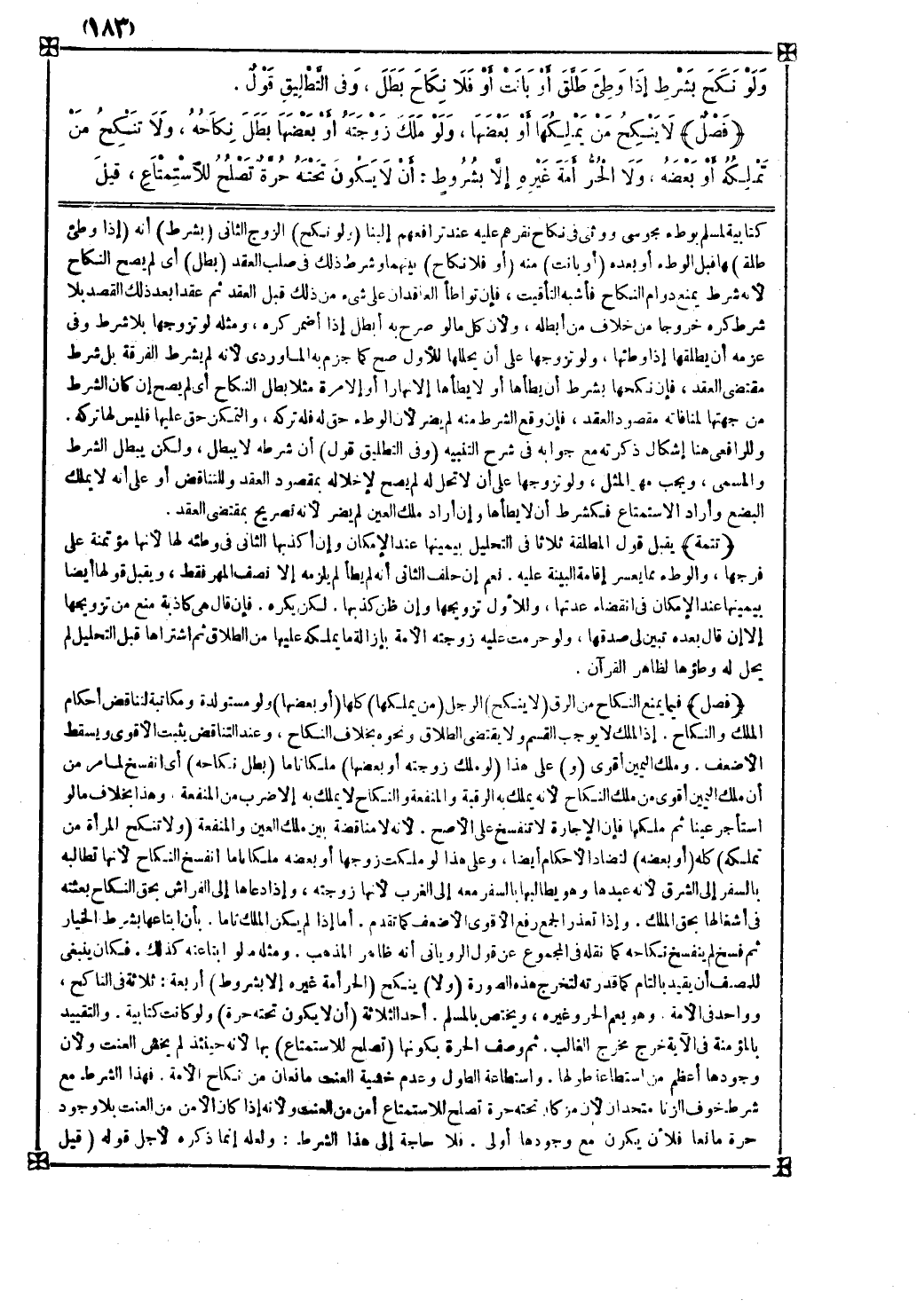 فإن نكحها بشرط أن يطأها أو لا يطأها إلا نهارا أو إلا مرة مثلا بطل النكاح أي لم يصح إن كان الشرط من جهتها لمنافاته مقصود العقد فإن وقع الشرط منه لم يضر لأن الوطء حق له فله تركه والتمكن حق عليها فليس لها تركة