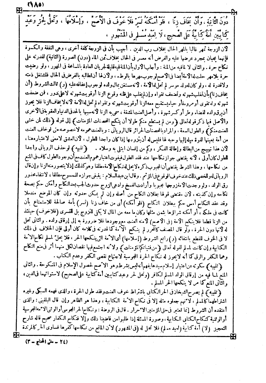 ( و ) رابع الشروط ( إسلامها ) أي الأمة التي ينكحها الحر فلا يحل لمسلم نكاح الأمة الكتابية وإن كانت لمسلم لقوله تعالى { من فتياتكم المؤمنات } ولأنه اجتمع فيها نقصان لكل منهما أثر في منع النكاح وهما الكفر والرق كما أنه لا يجوز له نكاح الحرة المجوسية لاجتماع نقصي الكفر وعدم الكتاب