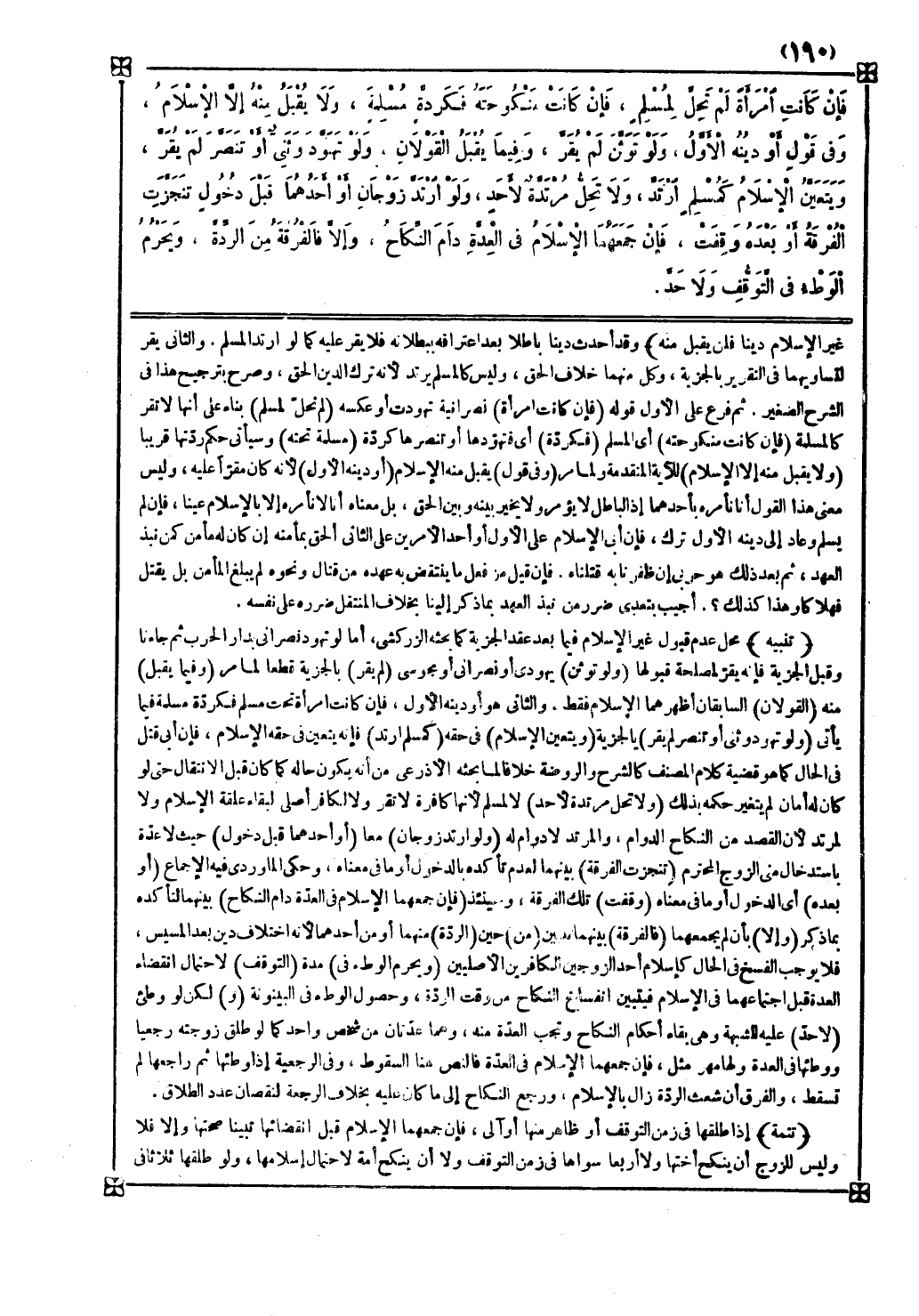 تتمة إذا طلقها في زمن التوقف أو ظاهر منها أو آلى فإن جمعهما الإسلام قبل انقضائها تبينا صحتها وإلا فلا وليس للزوج أن ينكح أختها ولا أربعا سواها في زمن التوقف ولا أن ينكح أمة لاحتمال إسلامها
