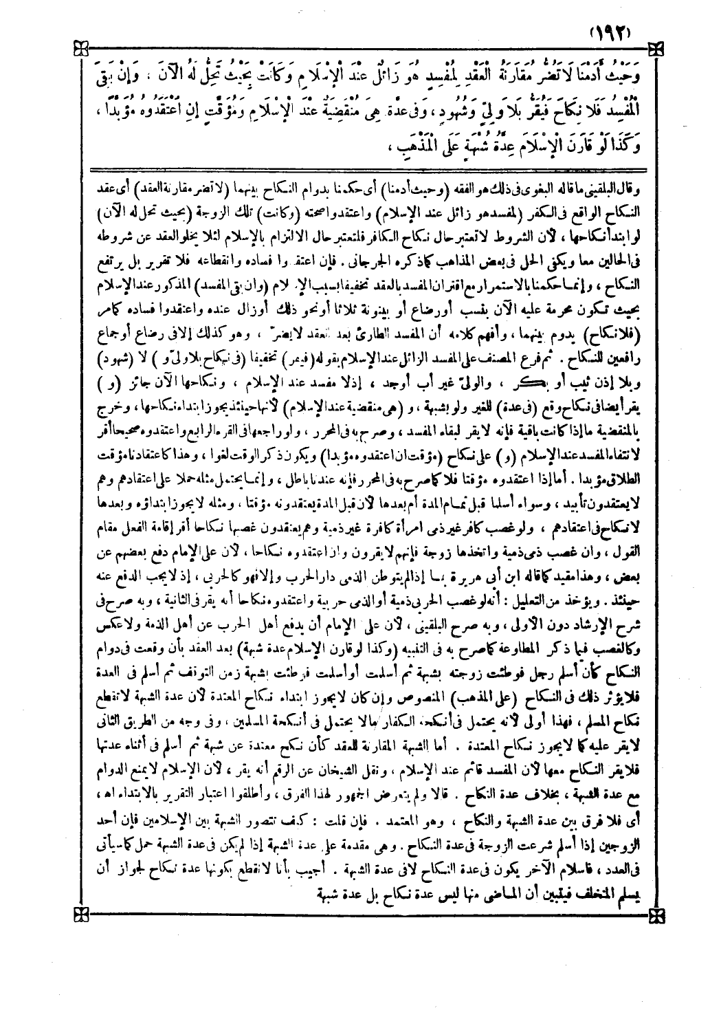 أما الشبهة المقارنة للعقد كأن نكح معتدة عن شبهة ثم أسلم في أثناء عدتها فلا يقر النكاح معها لأن المفسد قائم عند الإسلام