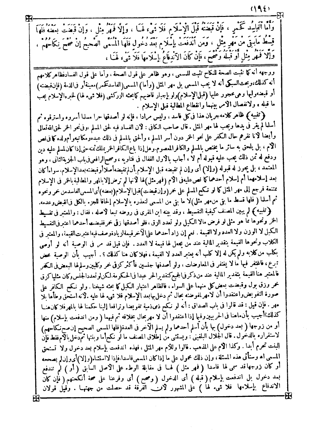 ( وأما ) المسمى ( الفاسد كخمر ) معينة أو في الذمة ( فإن قبضته ) أو قبضه وليها وهي محجور عليها ( قبل الإسلام ) ولو بإجبار قاضيهم كما بحثه الزركشي ( فلا شيء لها ) لخبر الإسلام يجب ما قبله ولانفصال الأمر بينهما وانقطاع المطالبة قبل الإسلام