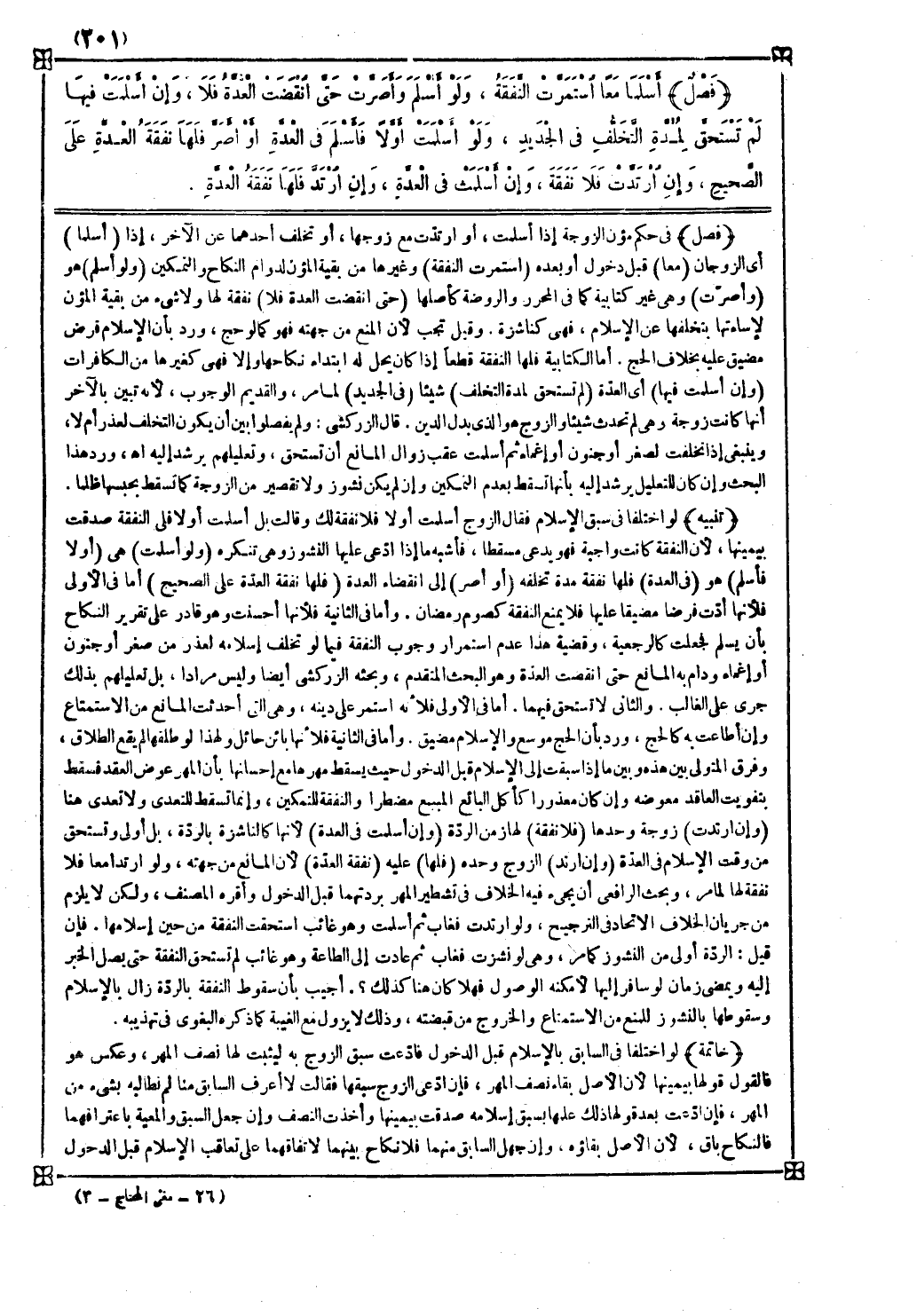 فصل في حكم مؤن الزوجة إذا أسلمت أو ارتدت مع زوجها أو تخلف أحدهما عن الآخر إذا ( أسلما ) أي الزوجان ( معا ) قبل دخول أو بعده ( استمرت النفقة ) وغيرها من بقية المؤن لدوام النكاح والتمكين