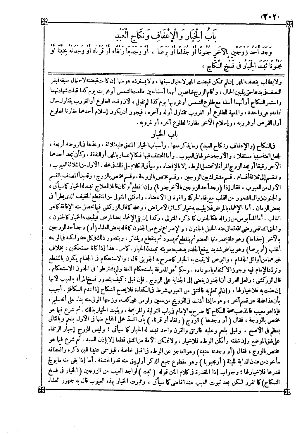 باب الخيار في النكاح ( والإعفاف ونكاح العبد ) وما يذكر معها وأسباب الخيار المتفق عليه ثلاثة وعدها في الروضة أربعة فجعل العتة سببا مستقلا والأوجه دخولها في العيوب