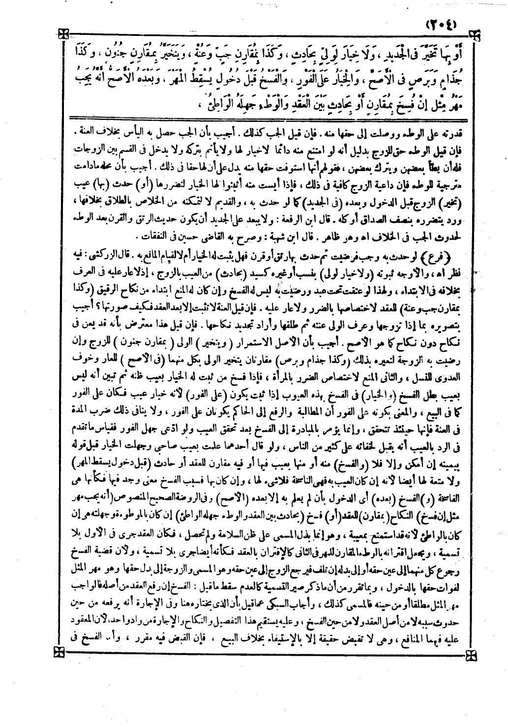 وبما تقرر من أن ما ذكر صير التسمية كالعدم سقط ما قيل الفسخ إن رفع العقد من أصله فالواجب مهر المثل مطلقا أو من حينه فالمسمى كذلك وأجاب السبكي عما قيل بأن الذي يختاره هنا وفي الإجارة أنه يرفعه من حين حدوث سببه لا من أصل العقد ولا من حين الفسخ وعليه يستقيم هذا التفصيل والنكاح والإجارة من واد واحد