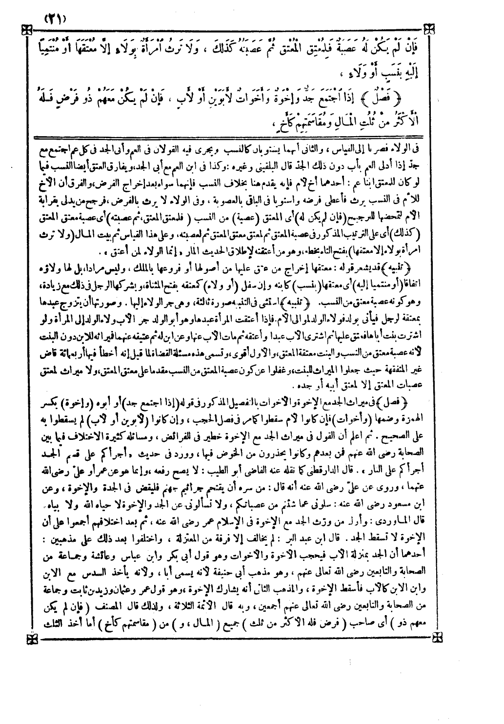 وعن ابن مسعود رضي الله عنه سلوني عما شئتم من عصباتكم ولا تسألوني عن الجد والإخوة لا حياه الله ولا بياه قال الماوردي وأول من ورث الجد مع الإخوة في الإسلام عمر رضي الله عنه