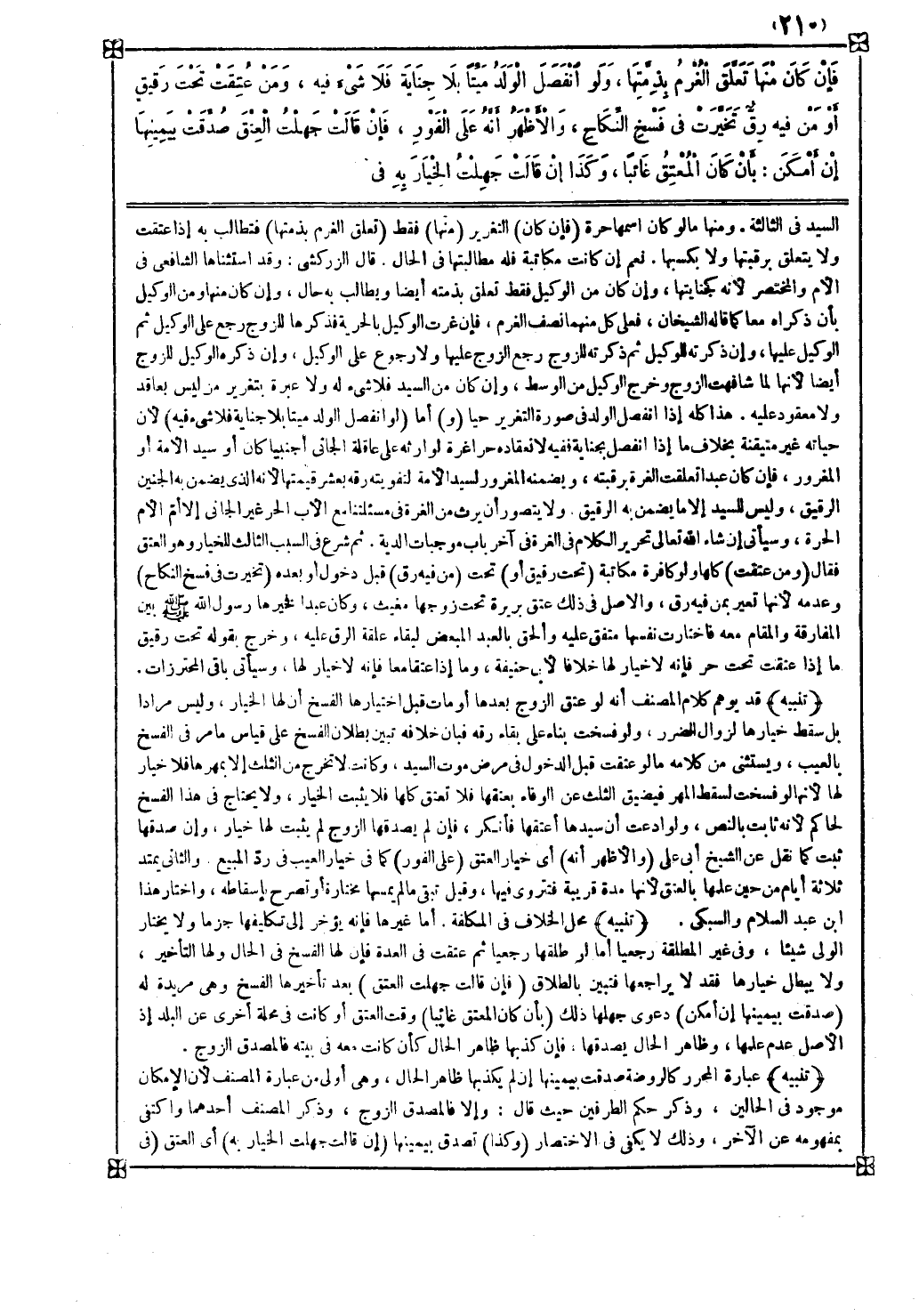 ثم شرع في السبب الثالث للخيار وهو العتق فقال ( ومن عتقت ) كلها ولو كافرة مكاتبة ( تحت رقيق أو ) تحت ( من فيه رق ) قبل دخول أو بعده ( تخيرت في فسخ النكاح ) وعدمه لأنها تعير بمن فيه رق والأصل في ذلك عتق بريرة تحت زوجها مغيث وكان عبدا فخيرها رسول الله صلى الله عليه وسلم بين المفارقة والمقام معه فاختارت نفسها متفق عليه وألحق بالعبد المبعض لبقاء علقة الرق عليه