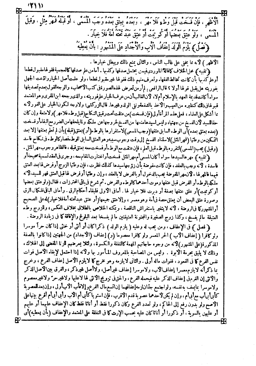 فصل في الإعفاف ومن يجب له وعليه ( يلزم الولد ) ذكرا كان أو أنثى أو خنثى إذا كان حرا موسرا ولو كافرا ( إعفاف الأب ) الحر المعسر ولو كافرا معصوما ( و ) إعفاف ( ( الأجداد ) من الجهتين إذا كانوا بالصفة المذكورة ( على المشهور ) لأنه من وجوه حاجاتهم المهمة كالنفقة والكسوة ولئلا يعرضهم للزنا المفضي إلى الهلاك وذلك لا يليق بحرمة الأبوة وليس من المصاحبة بالمعروف المأمور بها ولأنه إذا احتمل لإبقاء الأصل فوات نفس الفرع كما في القعود ففوات ماله أولى