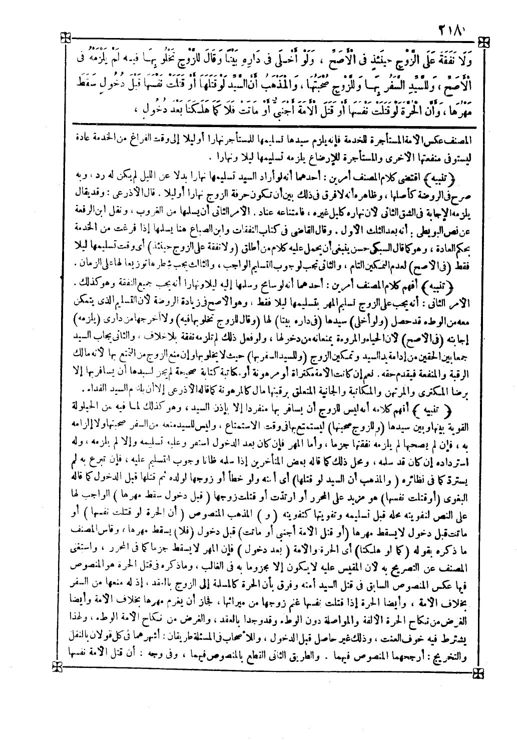 تنبيه أفهم كلامه أنه ليس للزوج أن يسافر بها منفردا إلا بإذن السيد وهو كذلك لما فيه من الحيلولة القوية بينها وبين سيدها