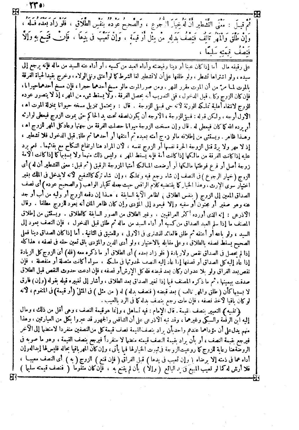 وقد نبه الأذرعي على أن الشافعي والجمهور قد عبروا بكل من العبارتين وهذا منهم يدل على أن مؤداهما عندهم واحد بأن يراد بنصف القيمة نصف قيمة كل من النصفين منفردا لا منضما إلى الآخر فيرجع بقيمة النصف أو بأن يراد بقيمة النصف قيمته منضما لا منفردا فيرجع بنصف القيمة وهو ما صوبه في الروضة هنا رعاية للزوج كما روعيت الزوجة في ثبوت الخيار لها فيما يأتي