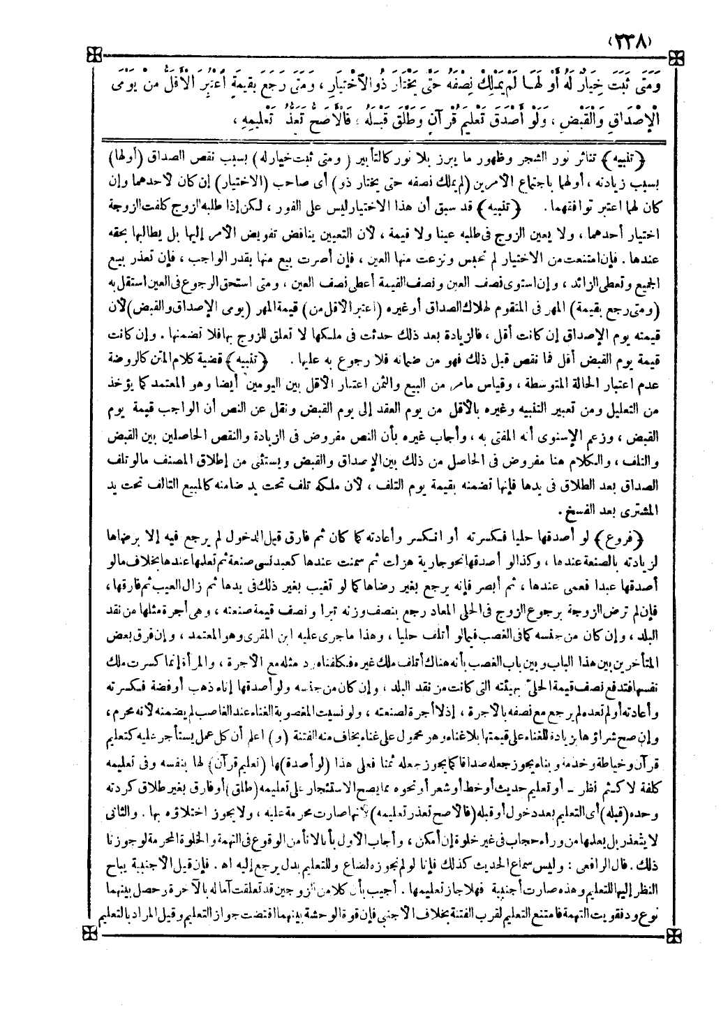 ( ومتى رجع بقيمة ) المهر في المتقوم لهلاك الصداق أو غيره ( اعتبر الأقل من ) قيمة المهر ( يومي الإصداق والقبض ) لأن قيمته يوم الإصداق إن كانت أقل فالزيادة بعد ذلك حدثت في ملكها لا تعلق للزوج بها فلا تضمنها وإن كانت قيمة يوم القبض أقل فما نقص قبل ذلك فهو من ضمانه فلا رجوع به عليها