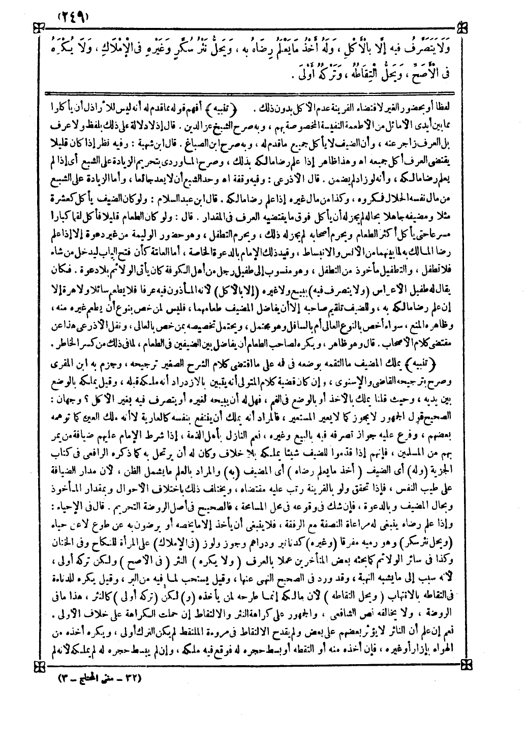 وحيث قلنا يملك بالأخذ أو بالوضع في الفم فهل له أن يبيحه لغيره أو يتصرف فيه بغير الأكل وجهان الصحيح قول الجمهور لا يجوز كما لا يعير المستعير فالمراد أنه يملك أن ينتفع بنفسه كالعارية لا أنه ملك العين كما توهمه بعضهم وفرع عليه جواز تصرفه فيه بالبيع وغيره نعم النازل بأهل الذمة إذا شرط الإمام عليهم ضيافة من يمر بهم من المسلمين فإنهم إذا قدموا للضيف شيئا يملكه بلا خلاف وكان له أن يرتحل به كما ذكره الرافعي في كتاب الجزية