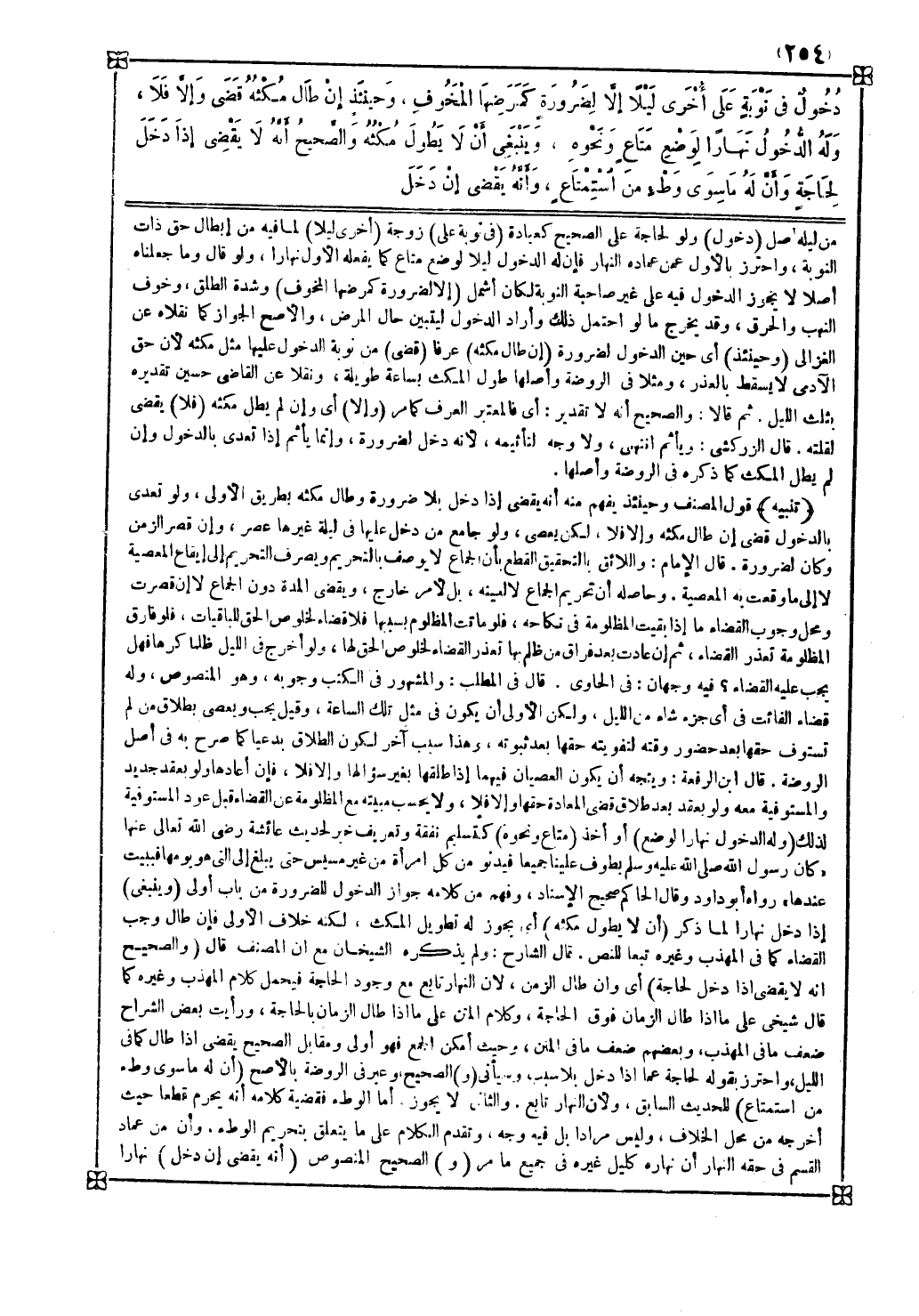 قال الشارح ولم يذكره الشيخان مع أن المصنف قال ( والصحيح أنه لا يقضي إذا دخل لحاجة ) أي وإن طال الزمن لأن النهار تابع مع وجود الحاجة فيحمل كلام المهذب وغيره كما قال شيخي على ما إذا طال الزمان فوق الحاجة وكلام المتن على ما إذا طال الزمان بالحاجة