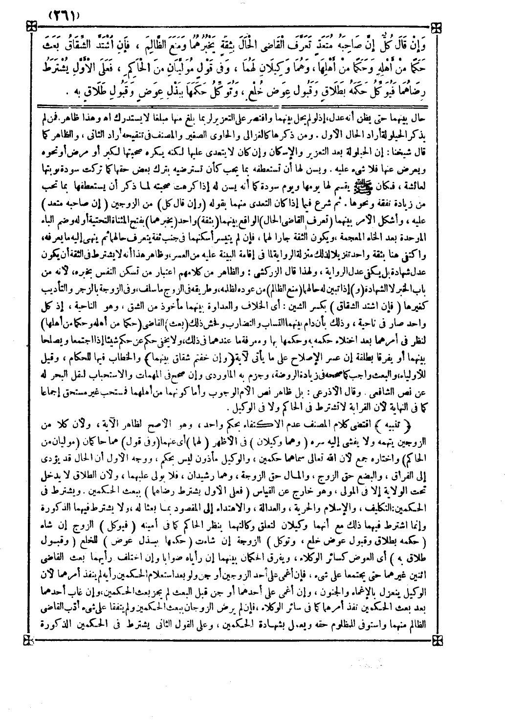 ( بعث ) القاضي ( حكما من أهله وحكما من أهلها ) لنظر في أمرهما بعد اختلاء حكمه به وحكمها بها ومعرفة ما عندهما في ذلك ولا يخفى حكم عن حكم شيئا إذا اجتمعا ويصلحا بينهما أو يفرقا بطلقة إن عسر الإصلاح على ما يأتي الآية { وإن خفتم شقاق بينهما } والخطاب فيها للحكام وقيل للأولياء