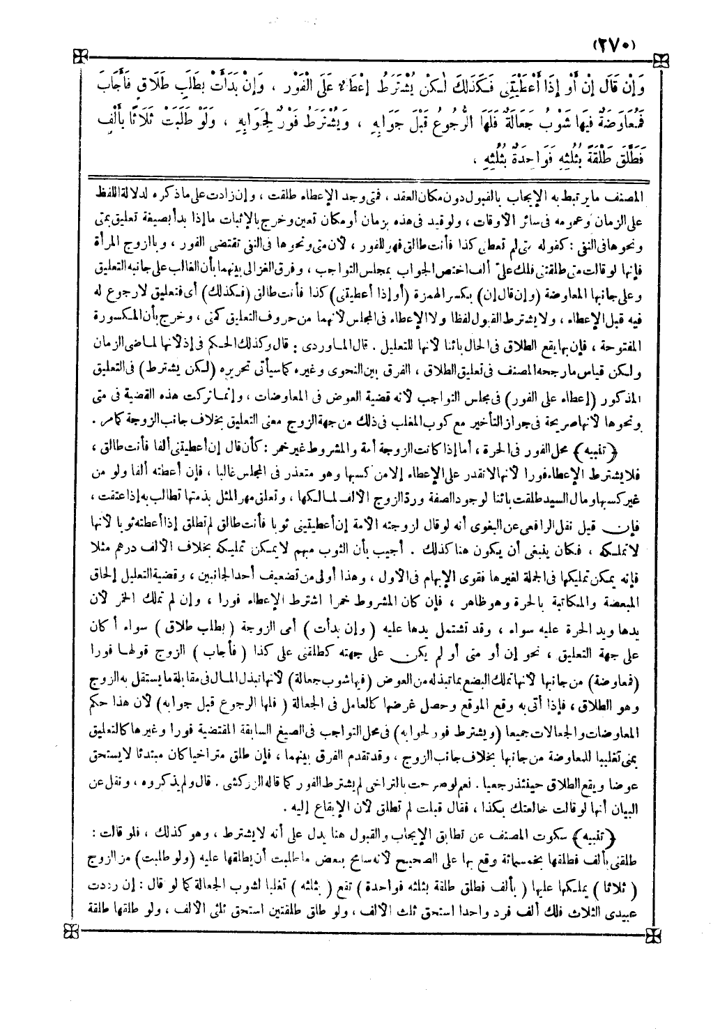 تنبيه محل الفور في الحرة أما إذا كانت الزوجة أمة والمشروط غير خمر كأن قال إن أعطيتني ألفا فأنت طالق فلا يشترط الإعطاء فورا لأنها لا تقدر على الإعطاء إلا من كسبها وهو متعذر في المجلس غالبا فإن أعطته ألفا ولو من غير كسبها ومال السيد طلقت بائنا لوجود الصفة ورد الزوج الألف لمالكها وتعلق مهر المثل بذمتها تطالب به إذا عتقت