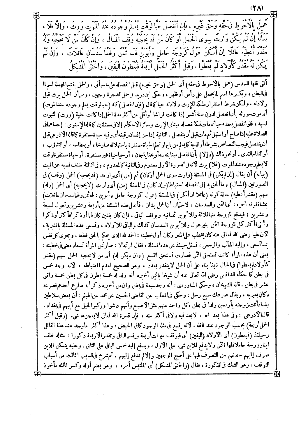 ( بيانه ) أن يقال ( إن لم يكن ) في المسألة ( وارث سوى الحمل أو كان ) ثم ( من ) أي وارث ( قد يحجبه ) الحمل ( وقف ) في الصورتين ( المال ) وما ألحق به إلى انفصاله احتياطا