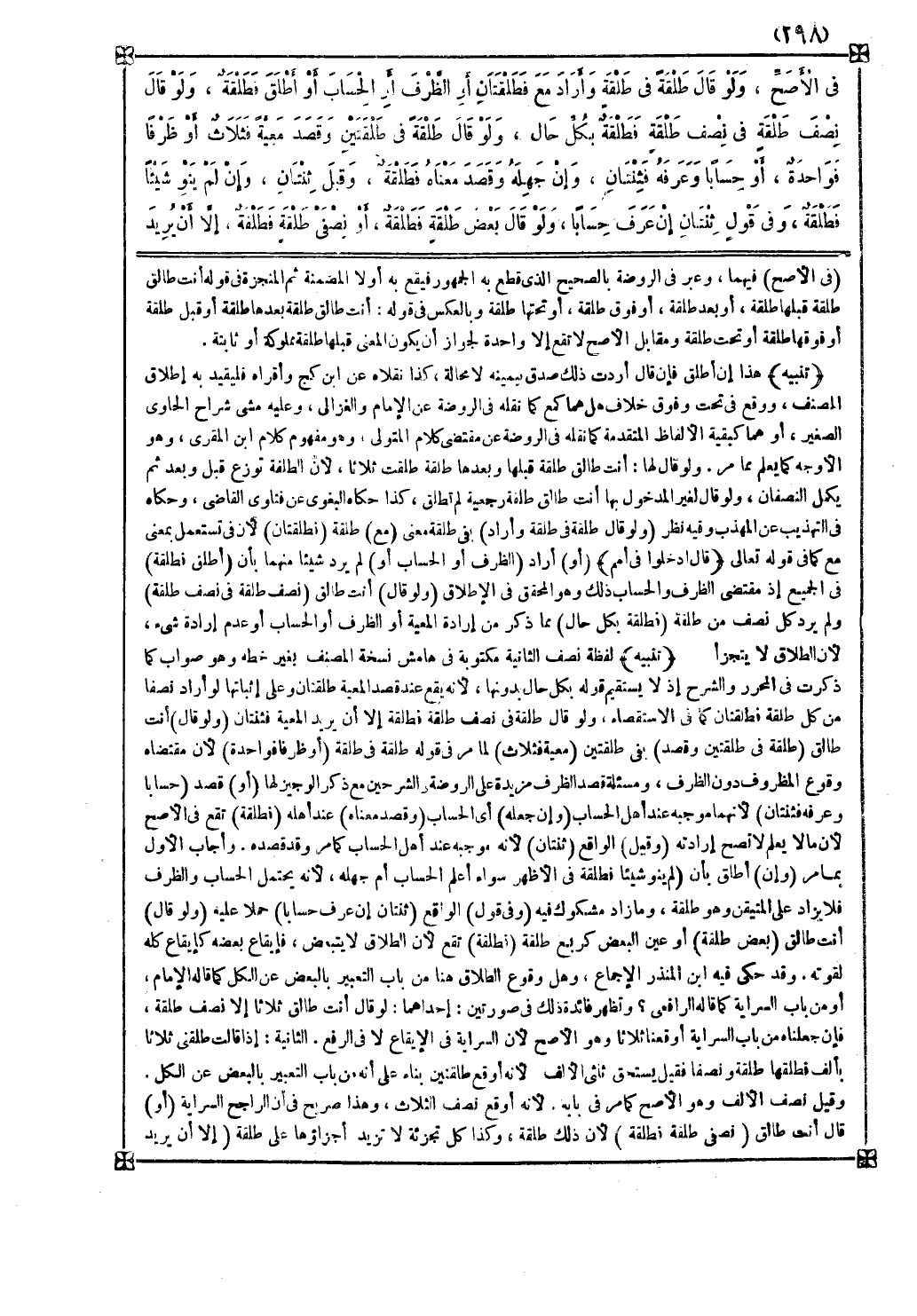 وهل وقوع الطلاق هنا من باب التعبير بالبعض عن الكل كما قاله الإمام أو من باب السراية كما قاله الرافعي وتظهر فائدة ذلك في صورتين إحداهما لو قال أنت طالق ثلاثا إلا نصف طلقة فإن جعلناه من باب السراية أوقعنا ثلاثا وهو الأصح لأن السراية في الإيقاع لا في الرفع