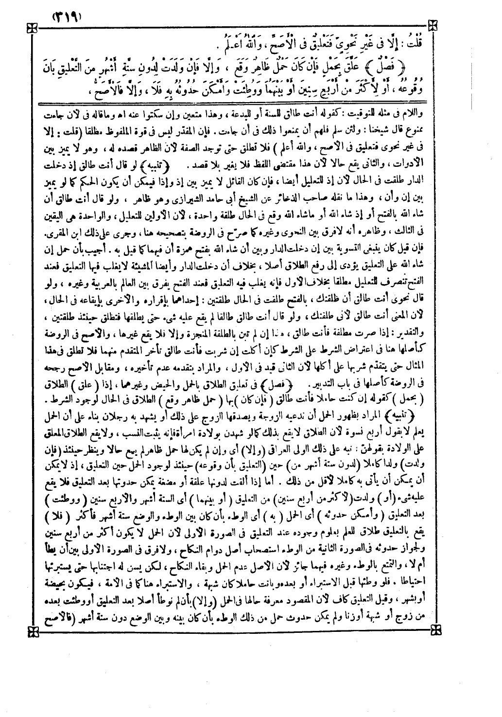 فصل في تعليق الطلاق بالحمل والحيض وغيرهما إذا ( علق ) الطلاق ( بحمل ) كقوله إن كنت حاملا فأنت طالق ( فإن كان ) بها ( حمل ظاهر وقع ) الطلاق في الحال لوجود الشرط