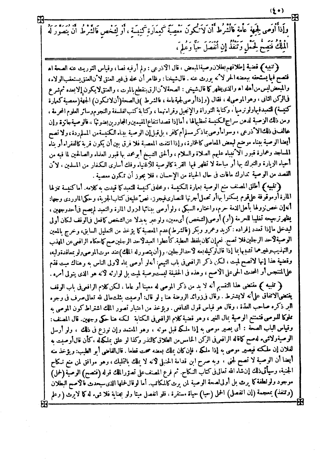 ثم شرع في الركن الثاني وهو الموصى له فقال ( وإذا أوصى لجهة عامة فالشرط ) في الصحة ( أن لا تكون ) الجهة ( معصية كعمارة كنيسة ) للتعبد فيها ولو ترميما وكتابة التوراة والإنجيل وقراءتهما وكتابة كتب الفلسفة والنجوم وسائر العلوم المحرمة ومن ذلك الوصية لدهن سراج الكنيسة تعظيما لها أما إذا قصد انتفاع المقيمين والمجاورين بضوئها فالوصية جائزة وإن خالف في ذلك الأذرعي