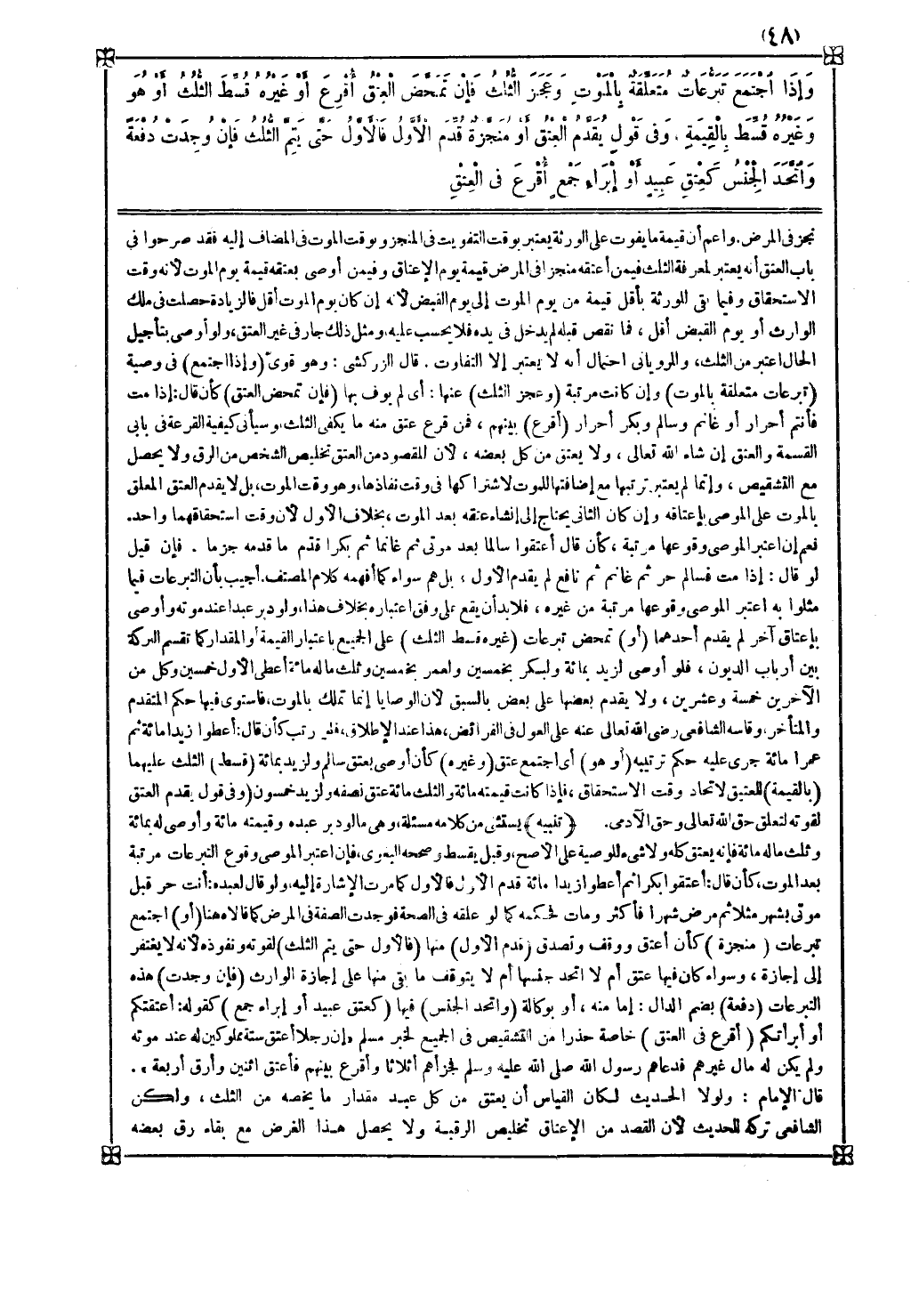 ولا يعتق من كل بعضه لأن المقصود من العتق تخليص الشخص من الرق ولا يحصل مع التشقيص وإنما لم يعتبر ترتبها مع إضافتها للموت لاشتراكها في وقت نفاذها وهو وقت الموت بل لا يقدم العتق المعلق بالموت على الموصى باعتاقه وإن كان الثاني يحتاج إلى إنشاء عتقه بعد الموت بخلاف الأول لأن وقت استحقاقهما واحد