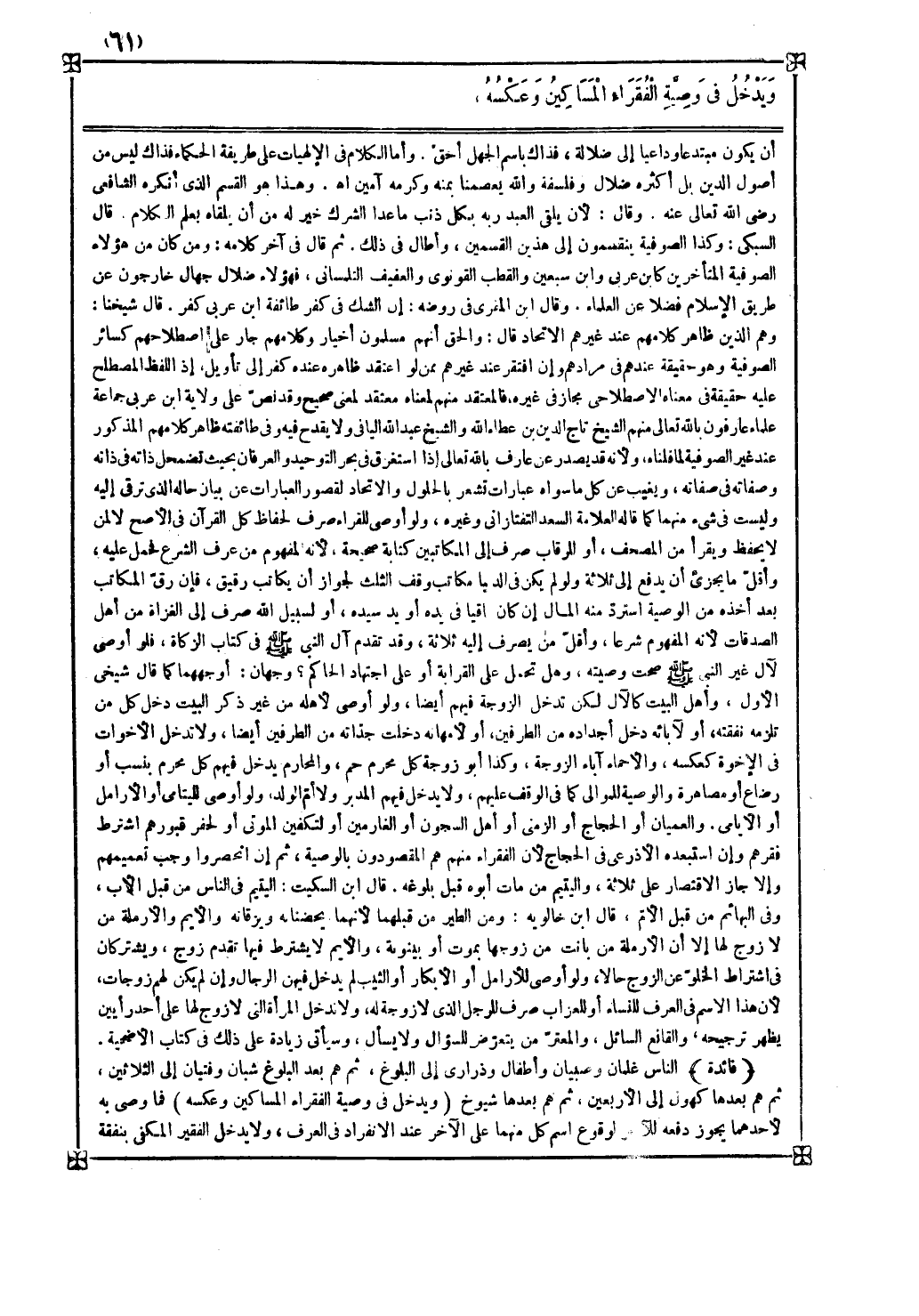 ( ويدخل في وصية الفقراء المساكين وعكسه ) فما وصى به لأحدهما يجوز دفعه للآخر لوقوع اسم كل منهما على الآخر عند الانفراد في العرف