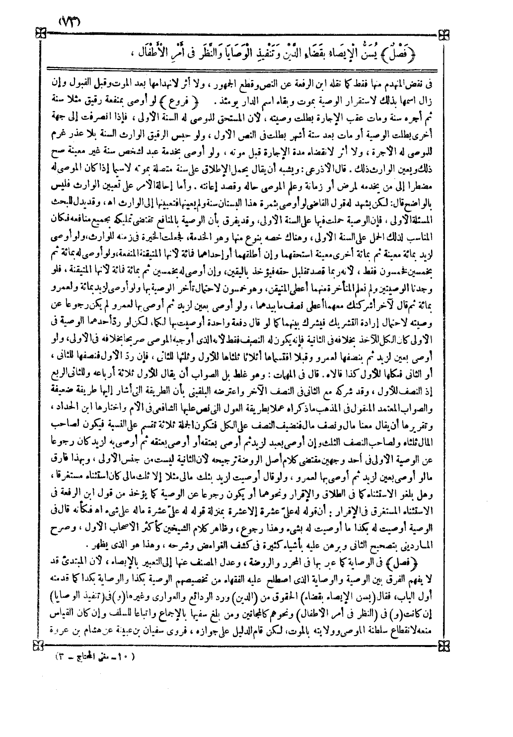 فصل في الوصاية كما عبر بها في المحرر والروضة وعدل المصنف عنها إلى التعبير بالإيصاء لأن المبتدىء قد لا يفهم الفرق بين الوصية والوصاية الذي اصطلح عليه الفقهاء من تخصيصهم الوصية بكذا والوصاية بكذا كما قدمته أول الباب فقال ( يسن الإيصاء بقضاء ) الحقوق من ( الدين ) ورد الودائع والعواري وغيرها ( و ) في ( تنفيذ الوصايا ) إن كانت ( و ) في ( النظر في أمر الأطفال ) ونحوهم كالمجانين ومن بلغ سفيها بالإجماع واتباعا للسلف وإن كان القياس منعه لانقطاع سلطنة الموصي وولايته بالموت لكن قام الدليل على جوازه فروى سفيان بن عيينة عن هشام بن عروة