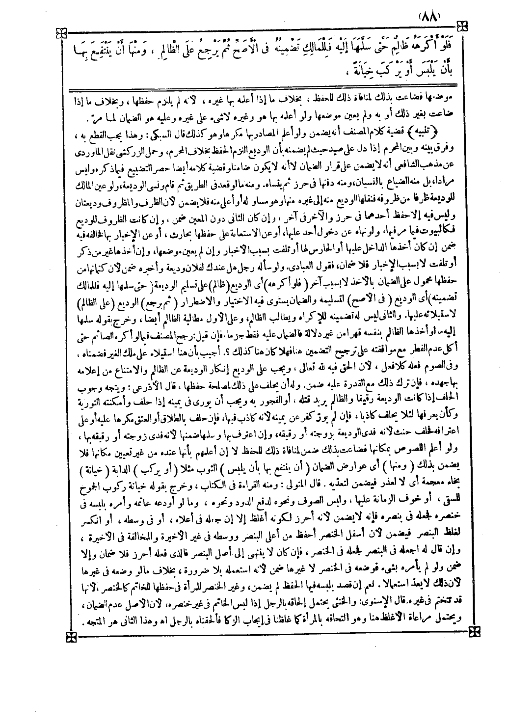 ويجب أن يوري في يمينه إذا حلف وأمكنته التورية وكأن يعرفها لئلا يحلف كاذبا فإن لم يور كفر عن يمينه لأنه كاذب فيها فإن حلف بالطلاق أو العتق مكرها عليه أو على اعترافه فحلف حنث لأنه فدى الوديعة بزوجته أو رقيقه وإن اعترف بها وسلمها ضمنها لأنه فدى زوجته أو رقيقه بها ولو أعلم اللصوص بمكانها فضاعت بذلك ضمن لمنافاة ذلك للحفظ لا إن أعلمهم بأنها عنده من غير تعيين مكانها فلا يضمن بذلك