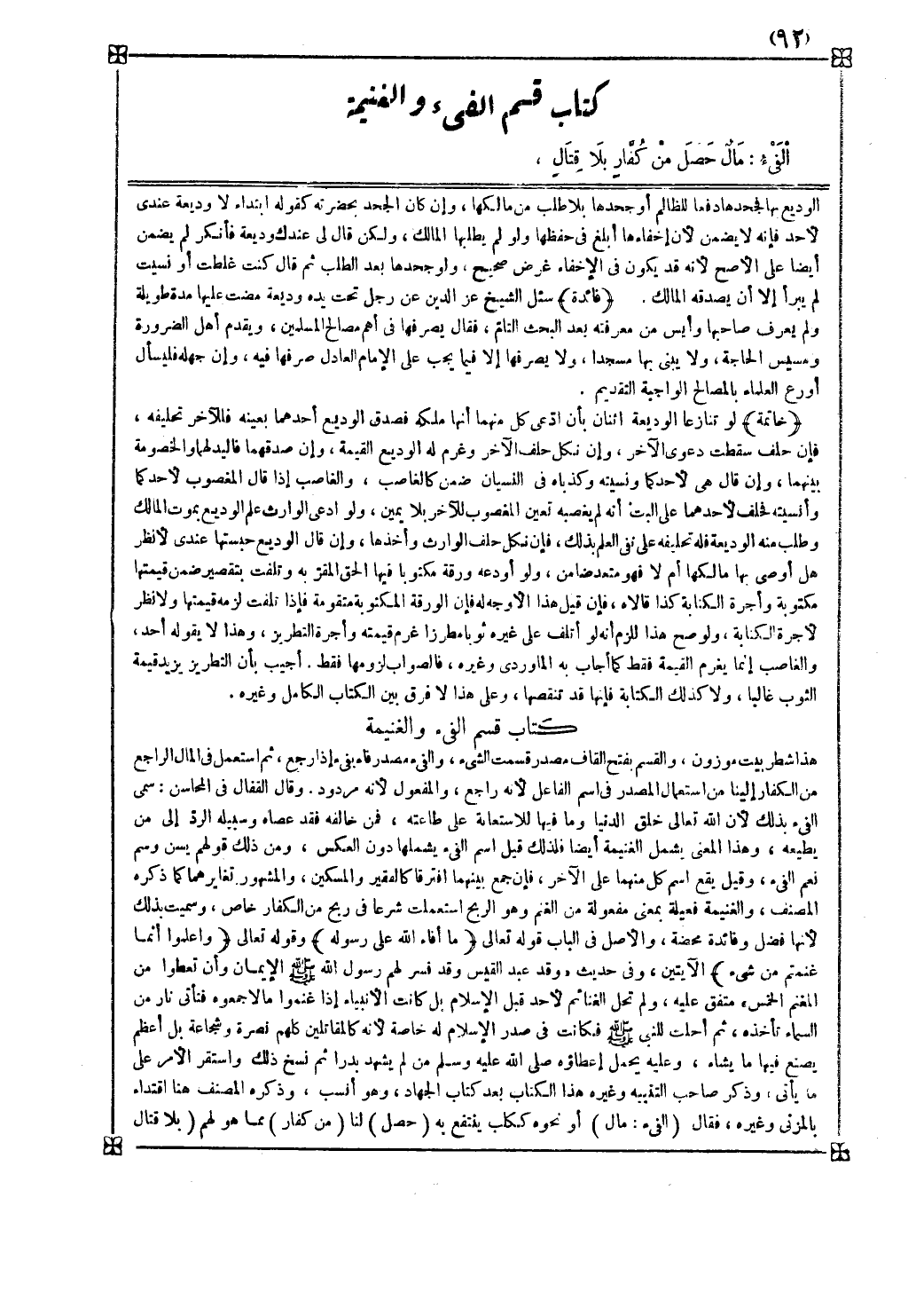 كتاب قسم الفيء والغنيمة هذا شطر بيت موزون والقسم بفتح القاف مصدر قسمت الشيء والفيء مصدر فاء يفيء إذا رجع ثم استعمل في المال الراجع من الكفار إلينا من استعمال المصدر في اسم الفاعل لأنه راجع والمفعول لأنه مردود