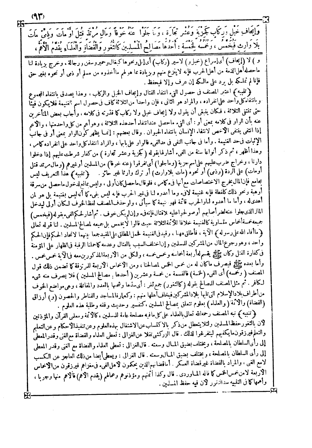 تنبيه نبه المصنف رحمه الله تعالى بالعلماء على كل ما فيه مصلحة عامة للمسلمين كالأئمة ومعلمي القرآن والمؤذنين لأن الثغور حفظ المسلمين ولئلا يتعطل من ذكر بالاكتساب عن الاشتغال بهذه العلوم وعن تنفيذ الأحكام وعن التعليم والتعلم فيرزقون ما يكفيهم ليتفرغوا لذلك