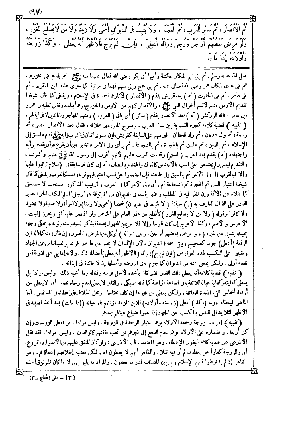 ثم بني عامر ثم بني الحارث ( ثم ) بعد قريش يقدم ( الأنصار ) لآثارهم الحميدة في الإسلام وينبغي كما قال شيخنا تقديم الأوس منهم لأنهم أخوال النبي صلى الله عليه وسلم والأنصار كلهم من الأوس والخزرج وهم أبناء حارثة بن ثعلبة بن عمرو بن عامر قاله الزركشي ( ثم ) بعد الأنصار يقدم ( سائر ) أي باقي ( العرب ) ومنهم المهاجرون الذين لا قرابة لهم