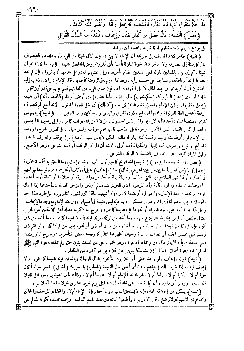 تنبيه يفهم من كلام المصنف أشياء أحدها أنه لا يصير وقفا بنفس الحصول بل لا بد من إنشاء وقف كما مر وقيل يصير وقفا بنفس الحصول كرق النساء بنفس الأسر وهو مقابل المذهب ثانيها تحتم الوقف وليس مرادا بل الذي في الشرح والروضة أن الإمام لو رأى قسمته أو بيعه وقسمة ثمنه جاز له ذلك لكن لا يقسم سهم المصالح بل يوقف وتصرف غلته في المصالح أو تباع ويصرف ثمنه إليها ولكن الوقف أولى