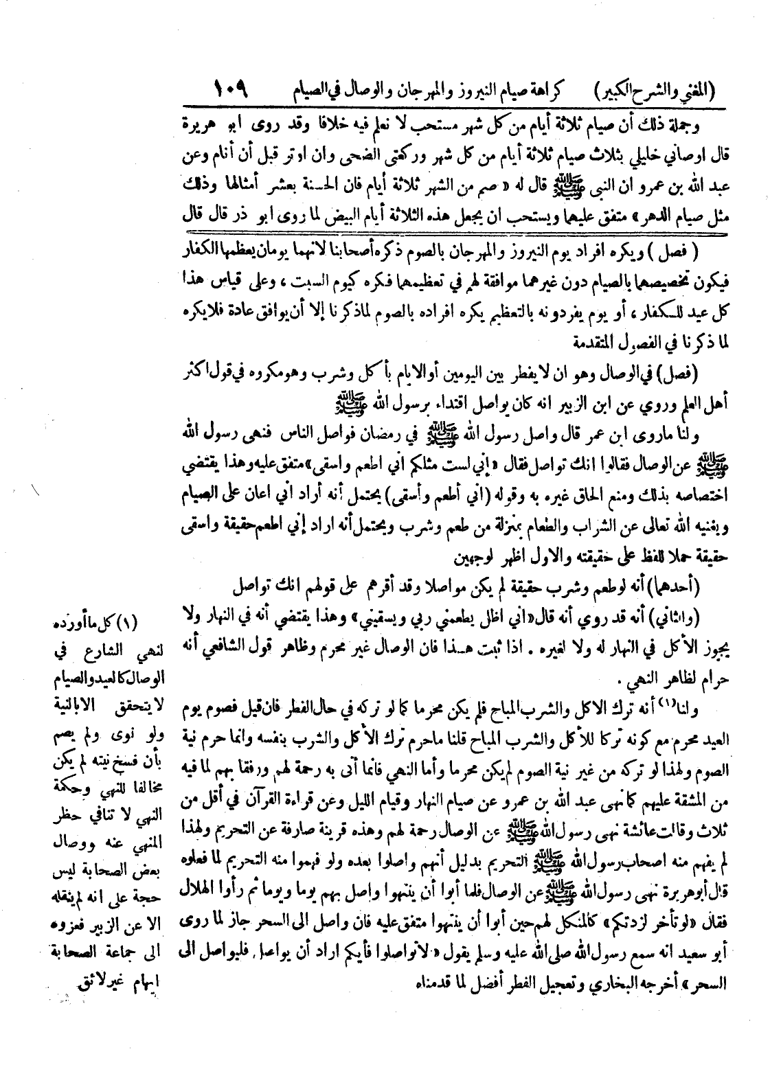 (فصل) ويكره أفراد يم النيروز والمهرجان بالصوم ذكره أصحابنا لأنهما يومان يعظمها الكفار فيكون تخصيصهما بالصيام دون غيرهما موافقة لهم في تعظيمهما فكره كيوم السبت، وعلى قياس هذا كل عيد للكفار، أو يوم يفردونه بالتعظيم يكره إفراده بالصوم لما ذكرنا إلا أن يوافق عادة فلا يكره لما ذكرنا في الفصول المتقدمة (فصل) في الوصال وهو أن لا يفطر بين اليومين أو الأيام بأكل وشرب وهو مكروه في قول أكثر أهل العلم وروى عن ابن الزبير أنه كان يواصل اقتداء برسول الله صلى الله عليه وسلم ولنا ما روى ابن عمر قال واصل رسول الله صلى الله عليه وسلم في رمضان فواصل الناس فنهى رسول الله صلى الله عليه وسلم عن الوصال فقالوا إنك تواصل فقال " إني لست مثلكم إني أطعم وأسقى " متفق عليه وهذا يقتضي