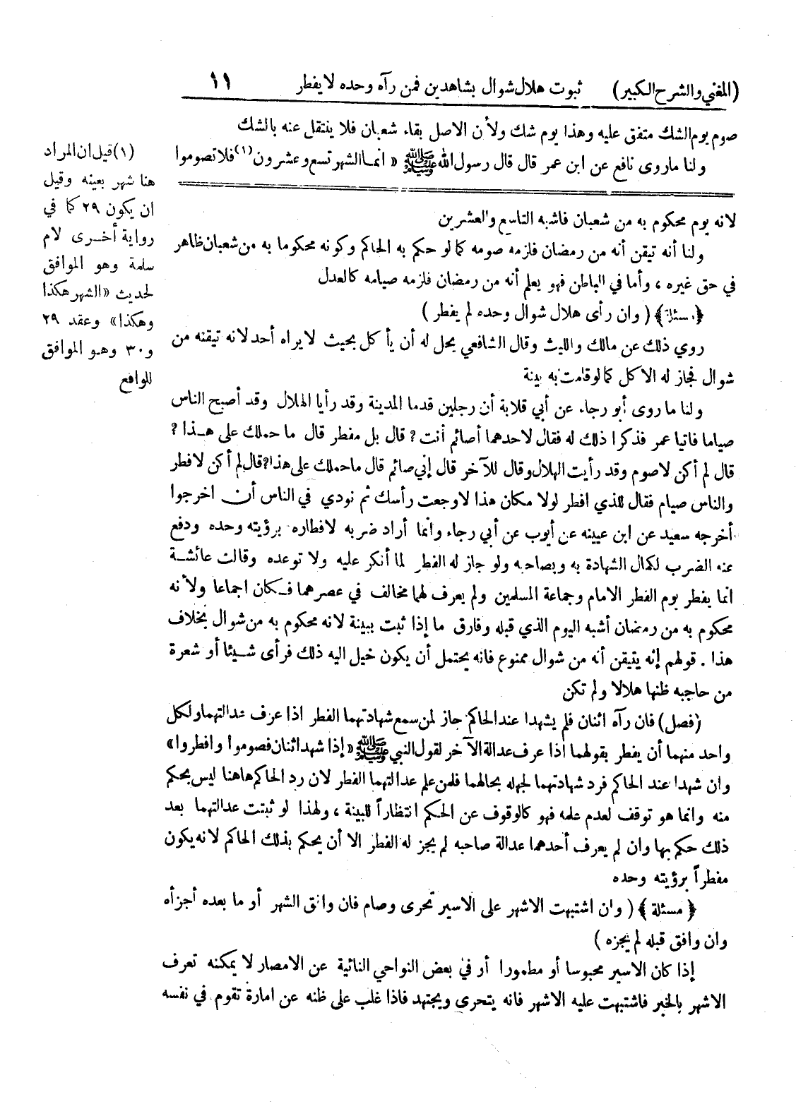في حق غيره، وأما في الباطن فهو يعلم أنه من رمضان فلزمه صيامه كالعدل (مسألة) (وإن رأى هلال شوال وحده لم يفطر) روى ذلك عن مالك والليث وقال الشافعي يحل له أن يأكل بحيث لا يراه أحد لأنه تيقنه من شوال فجاز له الأكل كما لو قامت به بينة ولنا ما روى أبو رجاء عن أبي قلابة أن رجلين قدما المدينة وقد رأيا الهلال وقد أصبح الناس صياماً فأتيا عمر فذكرا ذلك له فقال لأحدهما أصائم أنت؟ قال بل مفطر قال ما حملك على هذا؟ قال لم أكن لأصوم وقد رأيت الهلال وقال للآخر قال إني صائم قال ما حملك على هذا؟ قال لم أكن لأفطر والناس صيام فقال للذي افطر لولا مكان هذا لأوجعت رأسك ثم نودي في الناس أن اخرجوا أخرجه سعيد عن ابن عيينة عن أيوب عن أبي رجاء وإنما أراد ضربه لإفطاره برؤيته وحده ودفع عنه الضرب لكمال الشهادة به وبصاحبه ولو جاز له الفطر لما أنكر عليه ولا توعده وقالت عائشة إنما يفطر يوم الفطر الإمام وجماعة المسلمين ولم يعرف لهما مخالف في عصرهما فكان إجماعاً ولأنه محكوم به من رمضان أشبه اليوم الذي قبله وفارق ما إذا ثبت ببينة لأنه محكوم به من شوال بخلاف هذا.