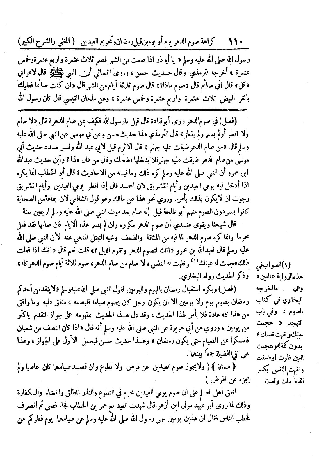 (فصل) ويكره استقبال رمضان باليوم واليومين لقول النبي صلى الله عليه وسلم " لا يتقدمن أحدكم رمضان بصوم يوم ولا يومين إلا أن يكون رجل كان يصوم صياماً فليصمه " متفق عليه وما وافق من هذا كله عادة فلا بأس لهذا الحديث، وقد دل هذا الحديث بمفهومة على جواز التقدم بأكثر من يومين، وروي عن أبي هريرة عن النبي صلى الله عليه وسلم أنه قال " اذا كان النصف من شعبان فامسكوا عن الصيام حتى يكون رمضان " وهذا حديث حسن فيحمل الأول على الجواز، وهذا على نفي الفضيلة جمعاً بينهما (مسألة) (ولا يجوز صوم العيدين عن فرض ولا تطوع وإن قصد صيامهما كان عاصياً ولم يجزه عن الفرض) اتفق أهل العلم على أن صوم يومي العيدين محرم في التطوع والنذر المطلق والقضاء والكفارة وذلك لما روى أبو عبيد مولى إبن أزهر قال شهدت العيد مع عمر بن الخطاب فجاء فصلى ثم انصرف فخطب الناس فقال إن هذين يومين نهى رسول الله (ص) عن صيامهما يوم فطركم من