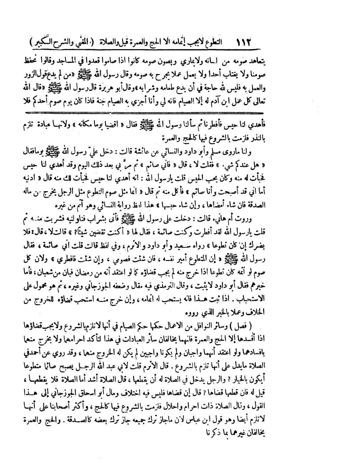 فأهدي لنا حيس فأفطرنا ثم سألنا رسول الله صلى الله عليه وسلم فقال " اقضيا يوما مكانه " ولأنها عبادة تلزم بالنذر فلزمت بالشروع فيها كالحج والعمرة ولنا ما روى مسلم وأبو داود والنسائي عن عائشة قالت: دخل علي رسول الله صلى الله عليه وسلم يوماً فقال " هل عندكم شئ " فقلت لا، قال " فإني صائم " ثم مر بي بعد ذلك اليوم وقد أهدي لنا حيس فخبأت له منه وكان يحب الحيس قلت يارسول الله: أنه أهدي لنا حيس فخبأت لك منه قال " ادنيه أما إني قد أصبحت وأنا صائم " فأكل منه ثم قال " إنما مثل صوم التطوع مثل الرجل يخرج من ماله الصدقة فإن شاء أمضاها، وإن شاء حبسها " هذا لفظ رواية النسائي وهو أتم من غيره وروت أم هانئ قالت: دخلت علي رسول الله صلى الله عليه وسلم فأتى بشراب فناولنيه فشربت منه ثم قلت يا رسول الله لقد أفطرت وكنت صائمة، فقال لها " أكنت تقضين شيئاً؟ " قالت لا، قال " فلا يضرك إن كان تطوعاً " رواه سعيد وأبو داود والاثرم، وفي لفظ قالت قلت إني صائمة، فقال رسول الله صلى الله عليه وسلم " إن المتطوع أمير نفسه، فإن شئت فصومي، وإن شئت فافطري " ولأن كل صوم لو أتمه كان تطوعاً إذا خرج منه لم يجب قضاؤه كما لو اعتقد أنه من رمضان فبان من شعبان، فأما خبرهم فقال أبو داود لا يثبت، وقال الترمذي فيه مقال وضعفه الجوزجاني وغيره، ثم هو محمول على الاستحباب، إذا ثبت هذا فإنه يستحب له إتمامه، وإن خرج منه استحب قضاؤه للخروج من الخلاف وعملا بالخبر الذي رووه (فصل) وسائر النوافل من الأعمال حكمها حكم الصيام في أنها لا تلزم بالشروع ولا يجب قضاؤها إذا أفسدها إلا الحج والعمرة فإنهما يخالفان سائر العبادات في هذا لتأكد إحرامهما ولا يخرج منهما بافسادهما ولو اعتقد أنهما واجبان ولم يكونا واجبين لم يكن له الخروج منهما، وقد روي عن احمد في الصلاة ما يدل على أنها تلزم بالشروع، قال الأثرم قلت لأبي عبد الله الرجل يصبح صائماً متطوعاً، أيكون بالخيار؟ والرجل يدخل في الصلاة له أن يقطعها، قال الصلاة أشد أما الصلاة فلا يقطعها، قيل له فإن قطعها قضاها؟ قال إن قضاها فليس فيه اختلاف ومال أبو إسحاق الجوزجاني إلى هذا