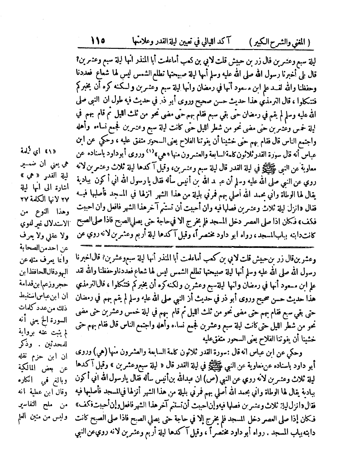 وعشرين قال زر بن بن حبيش قلت لأبي بن كعب أما علمت أبا المنذر أنها ليلة سبع وعشرين، قال اخبرنا رسول الله صلى الله عليه وسلم أنها ليلة صبيحتها تطلع الشمس ليس لها شعاع فعددنا وحفظنا والله لقد علم ابن مسعود أنها في رمضان وأنها ليلة سبع وعشرين ولكنه كره أن يخبركم فتتكلوا، قال الترمذي هذا حديث حسن صحيح وروى أبو ذر في حديث أن النبي صلى الله عليه وسلم لم يقم بهم في رمضان حتى بقي سبع فقام بهم حتى مضى نحو من ثلث الليل ثم قام بهم في ليلة خمس وعشرين حتى مضى نحو من شطر الليل حتى كانت ليلة سبع وعشرين فجمع نساءه وأهله واجتمع الناس قال فقام بهم حتى خشينا أن يفوتنا الفلاح يعني السحور متفق عليه وحكي عن ابن عباس أنه قال: سورة القدر ثلاثون كلمة السابعة والعشرين منها (هي) وروى أبو داود بإسناده عن معاوية عن النبي صلى الله عليه وسلم في ليلة القدر قال " ليلة سبع وعشرين " وقيل آكدها ليلة ثلاث وعشرين لأنه روي عن النبي صلى الله عليه وسلم إن عبد الله بن أنيس سأله فقال يارسول الله أني أكون