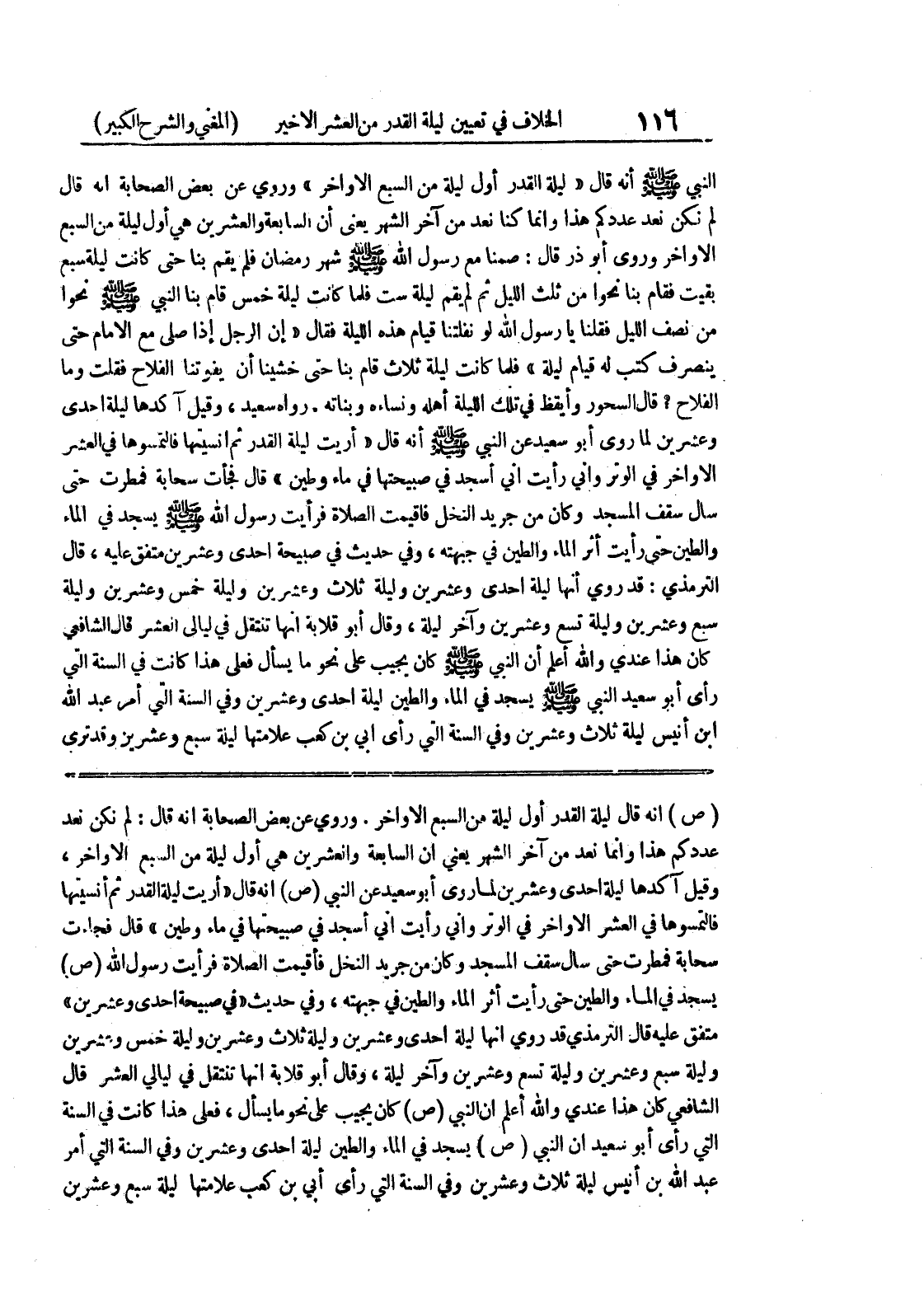 صلى الله عليه وسلم أنه قال ليلة القدر أول ليلة من السبع الأواخر، وروي عن بعض الصحابة أنه قال: لم نكن نعد عددكم هذا وإنما نعد من آخر الشهر يعني أن السابعة والعشرين هي أول ليلة من السبع الأواخر، وقيل آكدها ليلة إحدى وعشرين لما روى أبو سعيد عن النبي صلى الله عليه وسلم أنه قال " أريت ليلة القدر ثم أنسيتها فالتمسوها في العشر الأواخر في الوتر وإني رأيت أني أسجد في صبيحتها في ماء وطين " قال فجاءت سحابة فمطرت حتى سال سقف المسجد وكان من جريد النخل فأقيمت الصلاة فرأيت رسول الله صلى الله عليه وسلم يسجد في الماء والطين حتى رأيت أثر الماء والطين في جبهته، وفي حديث " في صبيحة إحدى وعشرين " متفق عليه قال الترمذي قد روي أنها ليلة إحدى وعشرين وليلة ثلاث وعشرين وليلة خمس وعشرين وليلة سبع وعشرين وليلة تسع وعشرين وآخر ليلة، وقال أبو قلابة أنها تنتقل في ليالي العشر قال الشافعي كان هذا عندي والله أعلم أن النبي صلى الله عليه وسلم كان يجيب على نحو ما يسأل، فعلى هذا كانت في السنة التي رأى أبو سعيد أن النبي صلى الله عليه وسلم يسجد في الماء والطين ليلة إحدى وعشرين وفي السنة التي أمر عبد الله بن أنيس ليلة ثلاث وعشرين وفي السنة التي رأى أبي بن كعب علامتها ليلة سبع وعشرين