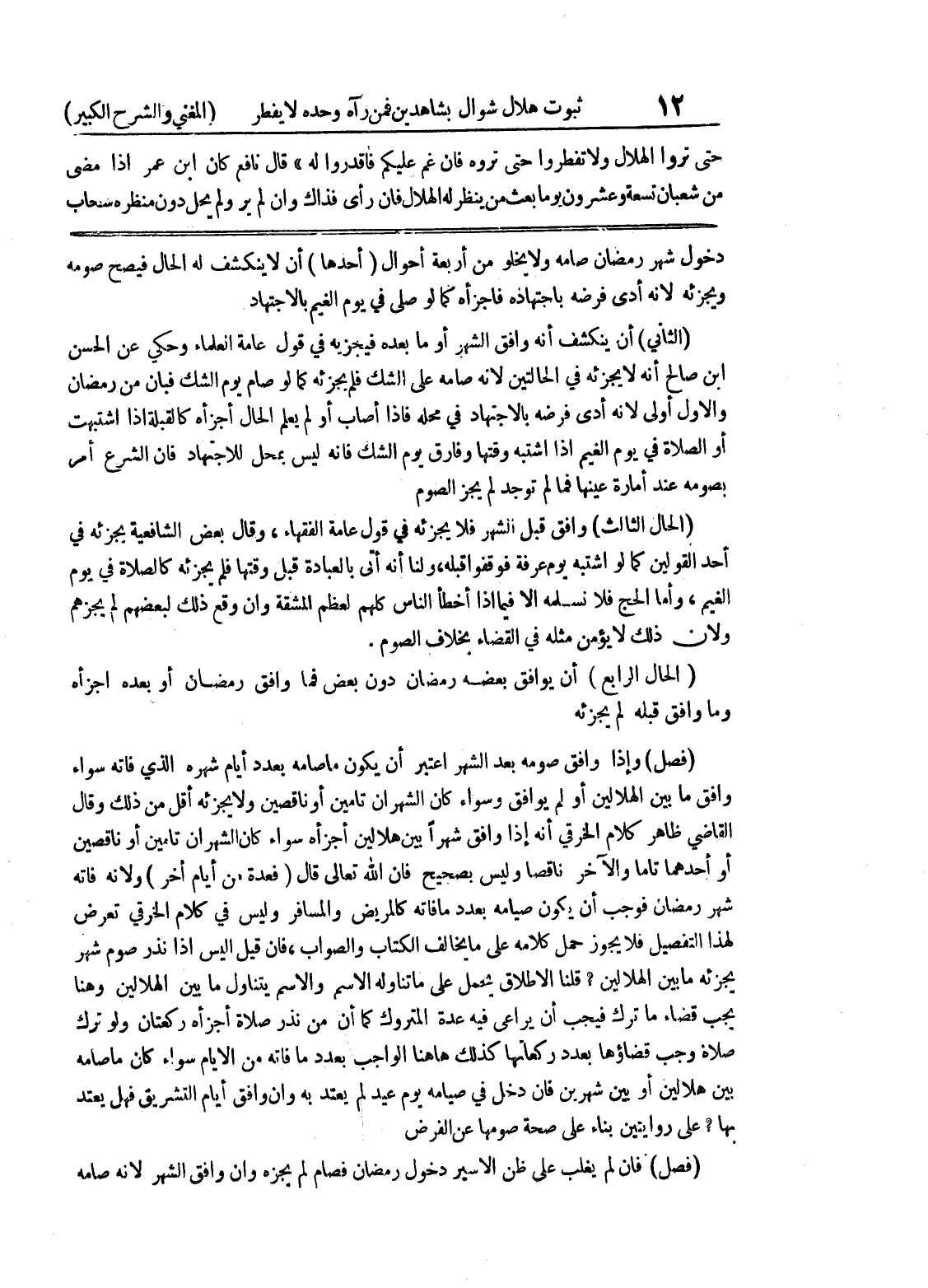 (الحال الرابع) أن يوافق بعضه رمضان دون بعض فما وافق رمضان أو بعده اجزأه وما وافق قبله لم يجزئه (فصل) وإذا وافق صومه بعد الشهر اعتبر أن يكون ما صامه بعدد أيام شهره الذي فاته سواء وافق ما بين الهلالين أو لم يوافق وسواء كان الشهران تامين أو ناقصين ولا يجزئه أقل من ذلك وقال القاضي ظاهر كلام الخرقي أنه إذا وافق شهراً بين هلالين أجزأه سواء كان الشهران تامين أو ناقصين أو أحدهما تاماً والآخر ناقصاً وليس بصحيح فإن الله تعالى قال (فعدة من أيام أخر) ولأنه فاته شهر رمضان فوجب أن يكون صيامه بعدد ما فاته كالمريض والمسافر وليس في كلام الخرقي تعرض لهذا التفصيل فلا يجوز حمل كلامه على ما يخالف الكتاب والصواب، فان قيل أليس إذا نذر صوم شهر