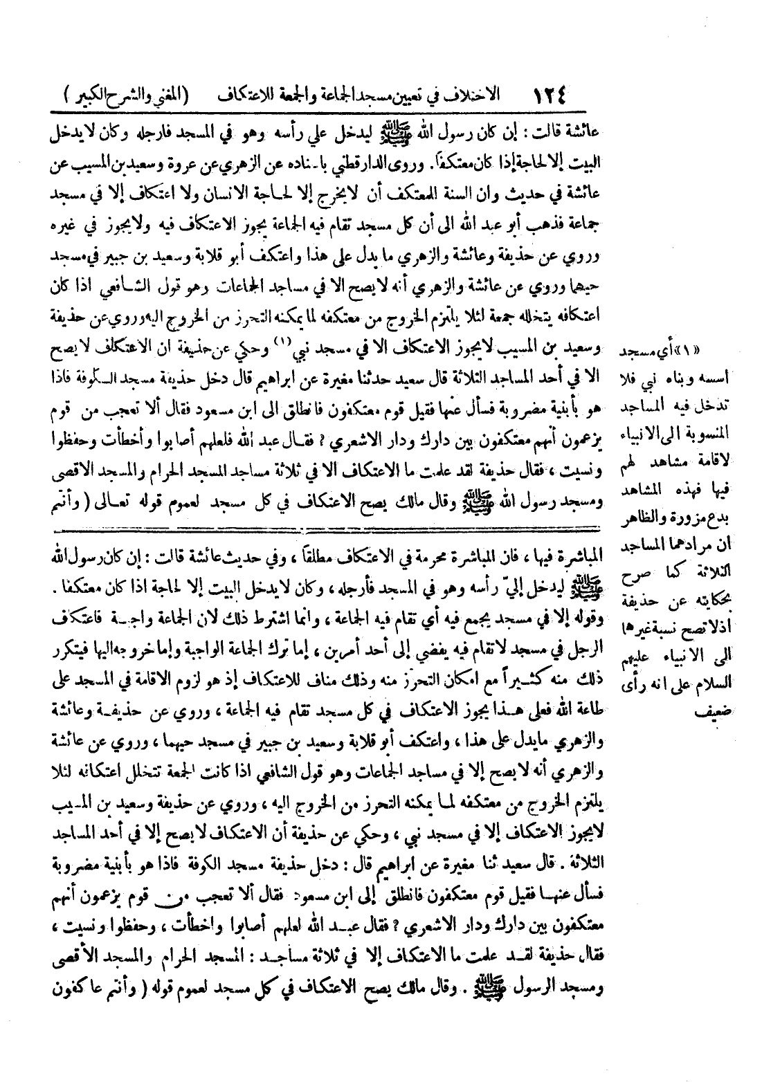 قال سعيد ثنا مغيرة عن إبراهيم قال: دخل حذيفة مسجد الكوفة فإذا هو بأبنية مضروبة فسأل عنها فقيل قوم معتكفون فانطلق الى ابن مسعود فقال ألا تعجب من قوم يزعمون أنهم معتكفون بين دارك ودار الاشعري؟ فقال عبد الله لعلهم أصابوا واخطأت، وحفظوا ونسيت، فقال حذيفة لقد علمت ما الاعتكاف إلا في ثلاثة مساجد: المسجد الحرام والمسجد الأقصى ومسجد الرسول صلى الله عليه وسلم.