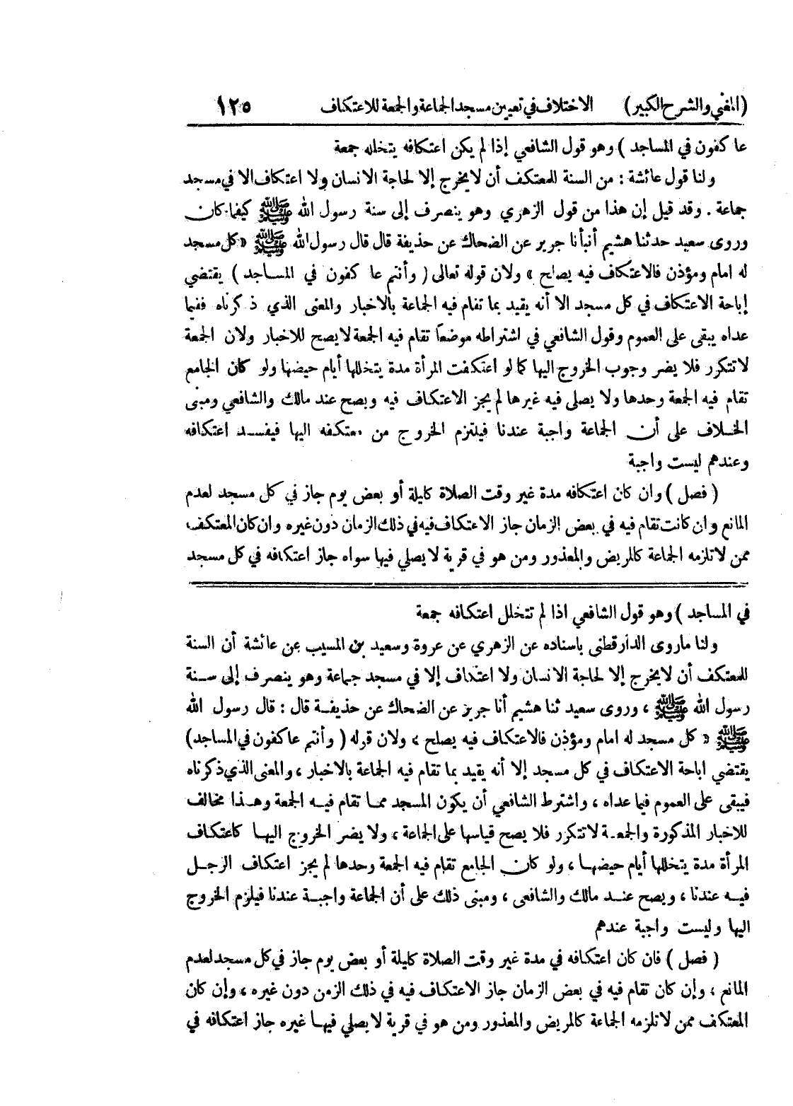 المرأة مدة يتخللها أيام حيضها، ولو كان الجامع تقام فيه الجمعة وحدها لم يجز اعتكاف الرجل فيه عندنا، ويصح عند مالك والشافعي، ومبنى ذلك على أن الجماعة واجبة عندنا فيلزم الخروج إليها وليست واجبة عندهم (فصل) فإن كان اعتكافه في مدة غير وقت الصلاة كليلة أو بعض يوم جاز في كل مسجد لعدم المانع، وإن كان تقام فيه في بعض الزمان جاز الاعتكاف فيه في ذلك الزمن دون غيره، وإن كان المعتكف ممن لا تلزمه الجماعة كالمريض والمعذور ومن هو في قرية لا يصلي فيها غيره جاز اعتكافه في