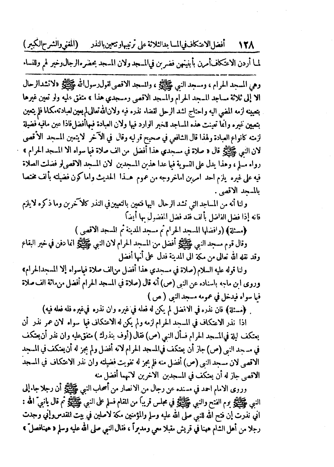 بتعيينه لزمه المضي إليه واحتاج لشد الرحل لقضاء نذره فيه ولأن الله تعالى لم يعين لعبادته مكاناً فلم يتعين بتعيين غيره وإنما تعينت هذه المساجد للخبر الوارد فيها ولأن العبادة فيها أفضل فإذا عين ما فيه فضيلة لزمته كأنواع العبادة ولهذا قال الشافعي في صحيح قوليه وقال في الآخر لا يتعين المسجد الأقصى لأن النبي صلى الله عليه وسلم قال " صلاة في مسجدي هذا أفضل من ألف صلاة فيما سواه إلا المسجد الحرام " رواه مسلم، وهذا يدل على التسوية فيما عدا هذين المسجدين لأن المسجد الأقصى لو فضلت الصلاة فيه على غيره يلزم أحد أمرين إما خروجه من عموم هذا الحديث وإما كون فضيلته بألف مختصاً بالمسجد الأقصى ولنا أنه من المساجد التي تشد الرحال إليها فتعين بالتعيين في النذر كالآخرين وما ذكره لا يلزم فإنه إذا فضل الفاضل بألف فقد فضل المفضول بها أيضاً (مسألة) (وأفضلها المسجد الحرام ثم مسجد المدينة ثم المسجد الأقصى) وقال قوم مسجد النبي صلى الله عليه وسلم أفضل من المسجد الحرام لأن النبي (ص) إنما دفن في خير البقاع وقد نقله الله تعالى من مكة إلى المدينة فدل على أنها أفضل ولنا قوله عليه السلام (صلاة في مسجدي هذا أفضل من ألف صلاة فيما سواه إلا المسجد الحرام " وروى ابن ماجة بإسناده عن النبي صلى الله عليه وسلم أنه قال (صلاة في المسجد الحرام أفضل من مائة ألف صلاة فيما سواه فيدخل في عمومه مسجد النبي صلى الله عليه وسلم (مسألة) (فإن نذره في الأفضل لم يكن له فعله في غيره وإن نذره في غيره فله فعله فيه) إذا نذر الاعتكاف في المسجد الحرام لزمه ولم يكن له الاعتكاف فيما سواه لان عمر نذر أن يعتكف ليلة في المسجد الحرام فسأل النبي صلى الله عليه وسلم فقال (أوف بنذرك) متفق عليه وإن نذر أن يعتكف في مسجد النبي صلى الله عليه وسلم جاز أن يعتكف في المسجد الحرام لأنه أفضل ولم يجز له أن يعتكف في المسجد الأقصى لأن مسجد النبي صلى الله عليه وسلم أفضل منه فلم يجز له تفويت فضيلته وإن نذر الاعتكاف في المسجد الأقصى جاز له أن يعتكف في المسجدين الآخرين لأنهما أفضل منه وروى الإمام أحمد في مسنده عن رجال من الأنصار من أصحاب النبي صلى الله عليه وسلم أن رجلا جاء إلى