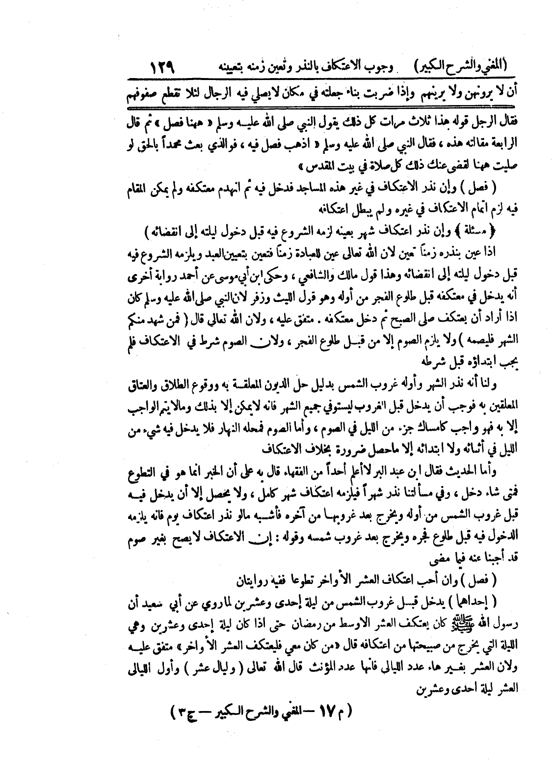 فقال الرجل قوله هذا ثلاث مرات كل ذلك يقول النبي صلى الله عليه وسلم " ههنا فصل " ثم قال الرابعة مقالته هذه، فقال النبي صلى الله عليه وسلم " اذهب فصل فيه، فو الذي بعث محمدا بالحق لو صليت ههنا لقضي عنك ذلك كل صلاة في بيت المقدس " (فصل) وإن نذر الاعتكاف في غير هذه المساجد فدخل فيه ثم انهدم معتكفه ولم يمكن المقام فيه لزم إتمام الاعتكاف في غيره ولم يبطل اعتكافه (مسألة) (وإن نذر اعتكاف شهر بعينه لزمه الشروع فيه قبل دخول ليلته إلى انقضائه) إذا عين بنذره زمناً تعين لأن الله تعالى عين للعبادة زمناً فتعين بتعيين العبد ويلزمه الشروع فيه قبل دخول ليلته إلى انقضائه وهذا قول مالك والشافعي، وحكى ابن أبي موسى عن أحمد رواية أخرى انه يدخل في معتكفه قبل طلوع الفجر من أوله وهو قول الليث وزفر لأن النبي صلى الله عليه وسلم كان إذا أراد أن يعتكف صلى الصبح ثم دخل معتكفه، متفق عليه، ولأن الله تعالى قال (فمن شهد منكم الشهر فليصمه) ولا يلزم الصوم إلا من قبل طلوع الفجر، ولأن الصوم شرط في الاعتكاف فلم يجب ابتداؤه قبل شرطه ولنا أنه نذر الشهر وأوله غروب الشمس بدليل حل الديون المعلقة به ووقوع الطلاق والعتاق المعلقين به فوجب أن يدخل قبل الغروب ليستوفي جميع الشهر فإنه لا يمكن إلا بذلك وما لا يتم الواجب إلا به فهو واجب كامساك جزء من الليل في الصوم، وأما الصوم فمحله النهار فلا يدخل فيه شئ من الليل في أثنائه ولا ابتدائه الا ما حصل ضرورة بخلاف الاعتكاف وأما الحديث فقال ابن عبد البر لا أعلم أحداً من الفقهاء قال به على أن الخبر إنما هو في التطوع فمتى شاء دخل، وفي مسألتنا نذر شهراً فيلزمه اعتكاف شهر كامل، ولا يحصل إلا أن يدخل فيه