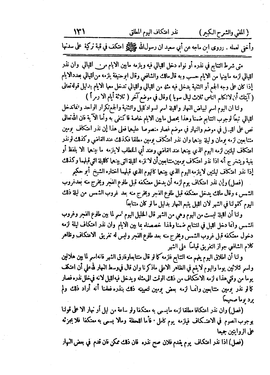متتابعين لزمه يومان وليلة بينهما وإن نذر اعتكاف يومين مطلقاً فكذلك عند القاضي وكذلك لو نذر اعتكاف ليلتين لزمه اليوم الذي بينهما عند القاضي وعند أبي الخطاب لا يلزمه ما بينهما إلا بلفظ أو بنية ويتخرج أنه إذا نذر اعتكاف يومين متتابعين أن لا تلزمه الليلة التي بينهما كالليلة التي قبلهما وكذلك إذا نذر اعتكاف ليلتين لا يلزمه اليوم الذي بينهما كاليوم الذي قبلهما اختاره الشيخ أبو حكيم (فصل) وإن نذر اعتكاف يوم لزمه أن يدخل معتكفه قبل طلوع الفجر ويخرج منه بعد غروب الشمس، وقال مالك يدخل معتكفه قبل طلوع الفجر ويخرج منه بعد غروب الشمس من ليلة ذلك اليوم كقولنا في الشهر لأن الليل يتبع النهار بدليل ما لو كان متتابعاً ولنا أن الليلة ليست من اليوم وهي من الشهر قال الخليل اليوم اسم لما بين طلوع الفجر وغروب الشمس وإنما دخل الليل في المتتابع ضمنا ولهذا خصصناه بما بين الأيام وإن نذر اعتكاف ليلة لزمه دخول معتكفه قبل غروب الشمس ويخرج منه بعد طلوع الفجر وليس له تفريق الاعتكاف وظاهر كلام الشافعي جواز التفريق قياساً على الشهر ولنا أن إطلاق اليوم يفهم منه التتابع فلزمه كما لو قال متتابعان وفارق الشهر فإنه اسم لما بين هلالين واسم لثلاثين يوماً واليوم لا يقع في الظاهر إلا على ما ذكرنا وإن قال في وسط النهار لله علي أن اعتكف يوما من وقتي هذا، لزمه الاعتكاف من ذلك الوقت إلى مثله ويدخل فيه الليل لأنه في خلل نذره فصار كما لو نذر يومين متتابعين وإنما لزمه بعض يومين لتعيينه ذلك بنذره فعلمنا أنه أراد ذلك ولم يرد يوماً صحيحاً (فصل) وإن نذر اعتكافاً مطلقاً لزمه ما يسمى به معتكفاً ولو ساعة من ليل أو نهار إلا على قولنا بوجوب الصوم في الاعتكاف فيلزمه يوم كامل فأما اللحظة ومالا يسمى به معتكفاً فلا يجزئه على الروايتين جميعاً (فصل) إذا نذر اعتكاف يوم يقدم فلان صح نذره فإن ذلك ممكن فإن قدم في بعض النهار