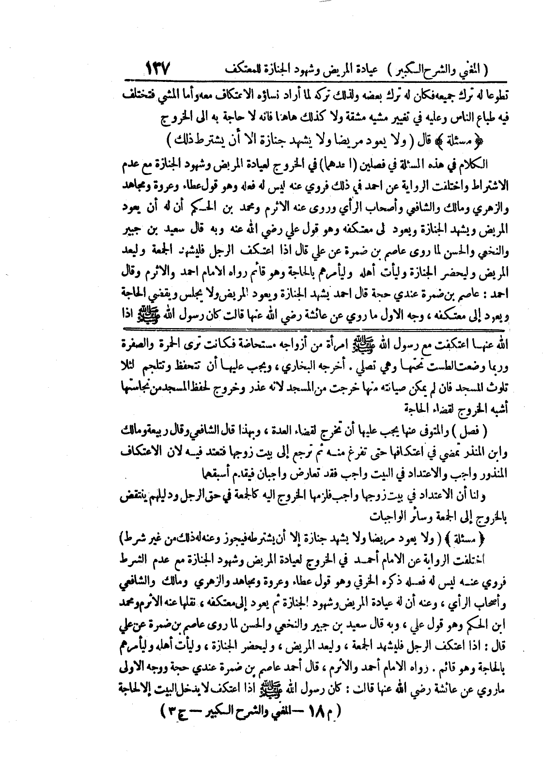 تلوث المسجد فإن لم يكن صيانته منها خرجت من المسجد لأنه عذر وخروج لحفظ المسجد من نجاستها أشبه الخروج لقضاء الحاجة (فصل) والمتوفى عنها يجب عليها أن تخرج لقضاء العدة، وبهذا قال الشافعي وقال ربيعة ومالك وابن المنذر تمضي في اعتكافها حتى تفرغ منه ثم ترجع إلى بيت زوجها فتعتد فيه لأن الاعتكاف المنذور واجب والاعتداد في البيت واجب فقد تعارض واجبان فيقدم أسبقهما ولنا أن الاعتداد في بيت زوجها واجب فلزمها الخروج إليه كالجمعة في حق الرجل ودليلهم ينتقض بالخروج إلى الجمعة وسائر الواجبات (مسألة) (ولا يعود مريضاً ولا يشهد جنازة إلا أن يشترطه فيجوز وعنه له ذلك من غير شرط) اختلفت الرواية عن الامام أحمد في الخروج لعيادة المريض وشهود الجنازة مع عدم الشرط فروي عنه ليس له فعله ذكره الخرقي وهو قول عطاء وعروة ومجاهد والزهري ومالك والشافعي وأصحاب الرأي، وعنه أن له عيادة المريض وشهود الجنازة ثم يعود إلى معتكفه، نقلها عنه الأثرم ومحمد ابن الحكم وهو قول علي، وبه قال سعيد بن جبير والنخعي والحسن لما روى عاصم بن ضمرة عن علي قال: إذا اعتكف الرجل فليشهد الجمعة، وليعد المريض، وليحضر الجنازة، وليأت أهله وليأمرهم بالحاجة وهو قائم، رواه الإمام أحمد والاثرم، قال أحمد عاصم بن ضمرة عندي حجة ووجه الأولى ماروي عن عائشة رضي الله عنها قالت: كان رسول الله صلى الله عليه وسلم إذا اعتكف لا يدخل البيت إلا لحاجة