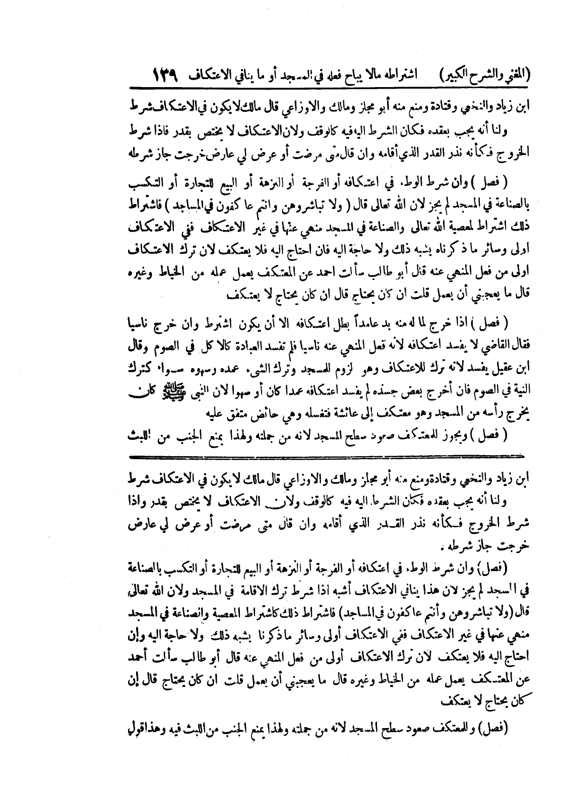 ابن زياد والنخعي وقتادة ومنع منه أبو مجاز ومالك والاوزاعي قال مالك لا يكون في الاعتكاف شرط ولنا أنه يجب بعقده فكان الشرط إليه فيه كالوقف ولأن الاعتكاف لا يختص بقدر وإذا شرط الخروج فكأنه نذر القدر الذي أقامه وإن قال متى مرضت أو عرض لي عارض خرجت جاز شرطه (فصل) وإن شرط الوطئ في اعتكافه أو الفرجة أو النزهة أو البيع للتجارة أو التكسب بالصناعة في المسجد لم يجز لأن هذا ينافي الاعتكاف أشبه إذا شرط ترك الإقامة في المسجد ولأن الله تعالى قال (ولا تباشروهن وأنتم عاكفون في المساجد) فاشتراط ذلك كاشتراط المعصية والصناعة في المسجد منهي عنها في غير الاعتكاف ففي الاعتكاف أولى وسائر ما ذكرنا يشبه ذلك ولا حاجة إليه وإن احتاج إليه فلا يعتكف لأن ترك الاعتكاف أولى من فعل المنهي عنه قال أبو طالب سألت أحمد عن المعتكف يعمل عمله من الخياط وغيره قال ما يعجبني أن يعمل قلت أن كان يحتاج قال إن كان يحتاج لا يعتكف (فصل) وللمعتكف صعود سطح المسجد لأنه من جملته ولهذا يمنع الجنب من اللبث فيه وهذا قول