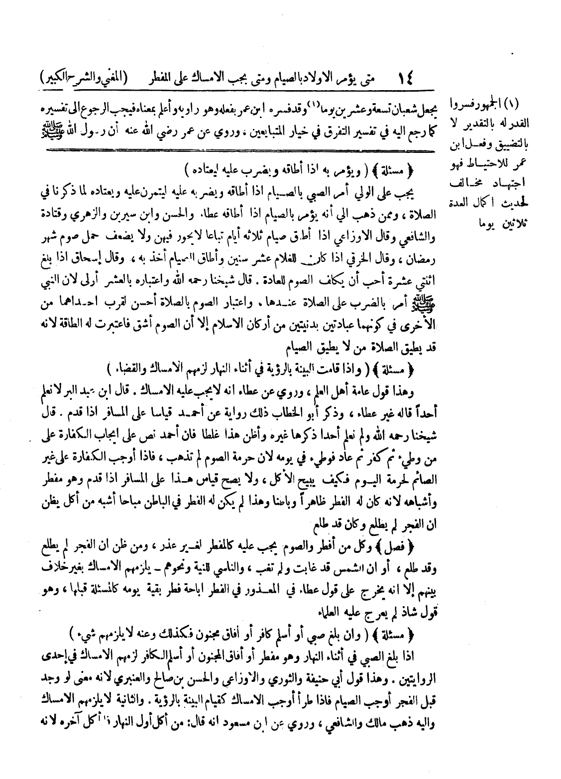 (مسألة) (ويؤمر به إذا أطاقه ويضرب عليه ليعتاده) يجب على الولي أمر الصبي بالصيام إذا أطاقه ويضربه عليه ليتمرن عليه ويعتاده لما ذكرنا في الصلاة، وممن ذهب إلى أنه يؤمر بالصيام إذا أطاقه عطاء والحسن وابن سيرين والزهري وقتادة والشافعي وقال الأوزاعي إذا أطاق صيام ثلاثة أيام تباعاً لا يحور فيهن ولا يضعف حمل صوم شهر رمضان، وقال الخرقي إذا كان للغلام عشر سنين وأطاق الصيام أخذ به، وقال إسحاق إذا بلغ اثنتي عشرة أحب أن يكلف الصوم للعادة، قال شيخنا رحمه الله واعتباره بالعشر أولى لأن النبي صلى الله عليه وسلم أمر بالضرب على الصلاة عندها، واعتبار الصوم بالصلاة أحسن لقرب إحداهما من الأخرى في كونهما عبادتين بدنيتين من أركان الاسلام الا أن الصوم أشق فاعتبرت له الطاقة لأنه قد يطيق الصلاة من لا يطيق الصيام (مسألة) (وإذا قامت البينة بالرؤية في أثناء النهار لزمهم الإمساك والقضاء) وهذا قول عامة أهل العلم، وروى عن عطاء انه لا يجب عليه الإمساك.