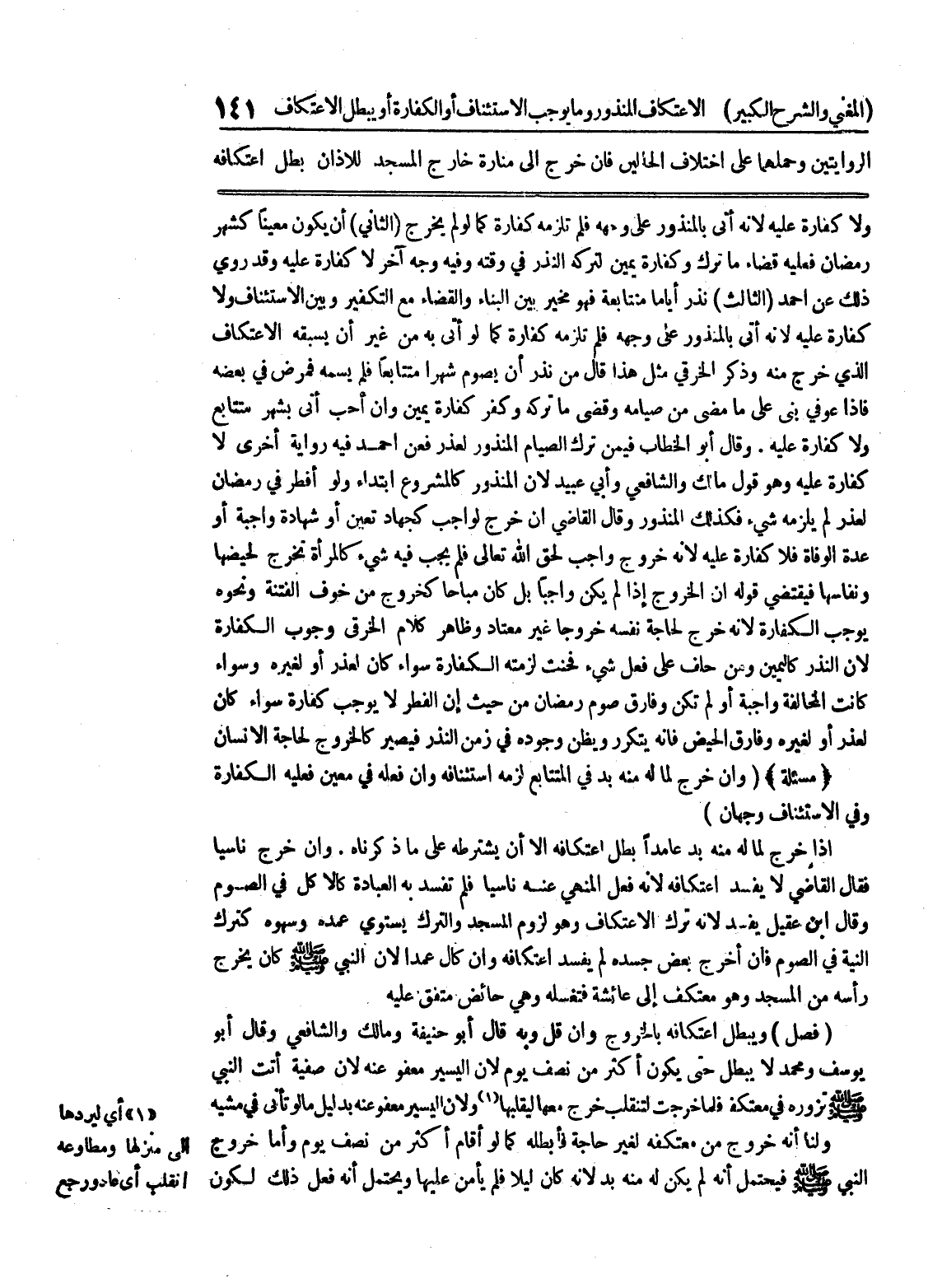رأسه من المسجد وهو معتكف الى عائشة فتغسله وهي حائض متفق عليه (فصل) ويبطل اعتكافه بالخروج وإن قل وبه قال أبو حنيفة ومالك والشافعي وقال أبو يوسف ومحمد لا يبطل حتى يكون اكثر من نصف يوم لأن اليسير معفوعنه لأن صفية أتت النبي صلى الله عليه وسلم تزوره في معتكفه فلما خرجت لتنقلب خرج معها ليقلبها (1) ولأن اليسير معفو عنه بدليل مالو تأنى في مشيه ولنا أنه خروج من معتكفه لغير حاجة فأبطله كما لو أقام اكثر من نصف يوم وأما خروج النبي صلى الله عليه وسلم فيحتمل أنه لم يكن له منه بد لأنه كان ليلاً فلم يأمن عليها ويحتمل أنه فعل ذلك لكو