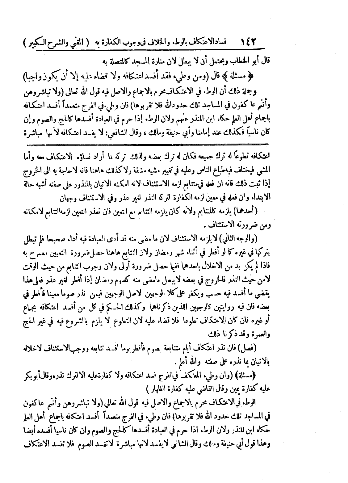 بالإتيان بما نذره على صفته والله أعلم (مسألة) (وإن وطئ المعتكف في الفرج فسد اعتكافه ولا كفارة عليه إلا لترك نذره وقال أبو بكر عليه كفارة يمين وقال القاضي عليه كفارة الظهار) الوطئ في الاعتكاف محرم بالإجماع والأصل فيه قول الله تعالى (ولا تباشروهن وأنتم عاكفون في المساجد تلك حدود الله فلا تقربوها) فإن وطئ في الفرج متعمداً أفسد اعتكافه بإجماع أهل العلم حكاه ابن المنذر ولان الوطئ إذا حرم في العبادة أفسدها كالحج والصوم وإن كان ناسياً أفسده أيضاً وهذا قول أبي حنيفة ومالك وقال الشافعي لا يفسد لأنها مباشرة لا تفسد الصوم فلا تفسد الاعتكاف